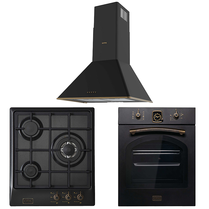 Вытяжка Korting KHC 6648 RN дополняет комплект, обеспечивая чистоту и свежесть воздуха на вашей кухне. Она работает в двух режимах: отвод и циркуляция, и имеет три скорости работы. Также, как и остальная техника в комплекте, вытяжка выполнена в черном цвете, что придает ей элегантность и современность.