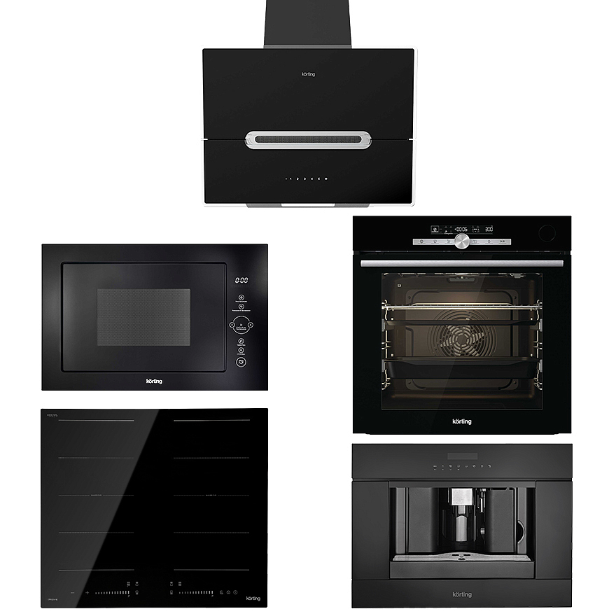 Комплект бытовой техники Korting включает в себя варочную панель HIB 68900 B iMove, духовой шкаф OKB 9982 EN ST, вытяжку KHC 61950 GXN, встраиваемую микроволновую печь KMI 825 TGN и встраиваемую кофемашину KCM 9200 BG. Все элементы комплекта выполнены в стильном черном цвете, что создает единый дизайнерский акцент на вашей кухне.