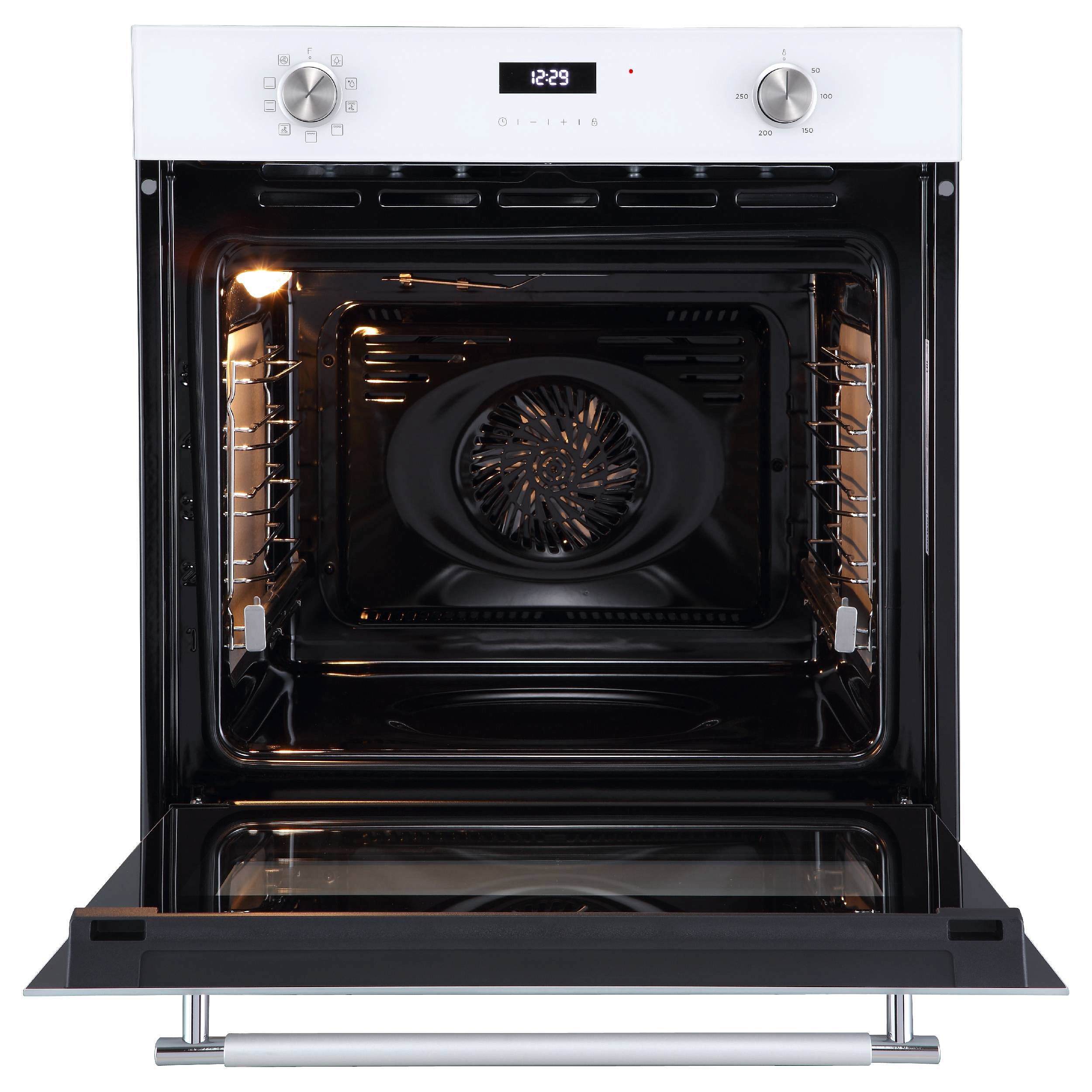 Это гармоничное сочетание лаконичного дизайна и продуманной функциональности. Белоснежный корпус в дуэте с элементами из нержавеющей стали придаёт кухне свежесть и визуально увеличивает пространство. Чёткие линии и минималистичная панель управления отсылают к эстетике коллекции Spectrum. Прибор рассчитан на встраивание в стандартную нишу шириной 60 см: его точные габариты — 59,5×59,5×59,5 см, а рекомендуемые параметры ниши — 59×56,8×55 см — гарантируют плотную и аккуратную установку без подгонки. Объём рабочей камеры составляет 72 литра, что позволяет одновременно готовить объёмные блюда и несколько противней. Трёхслойное остекление дверцы и тангенциальное охлаждение снижают внешнюю температуру корпуса, повышая безопасность при эксплуатации.