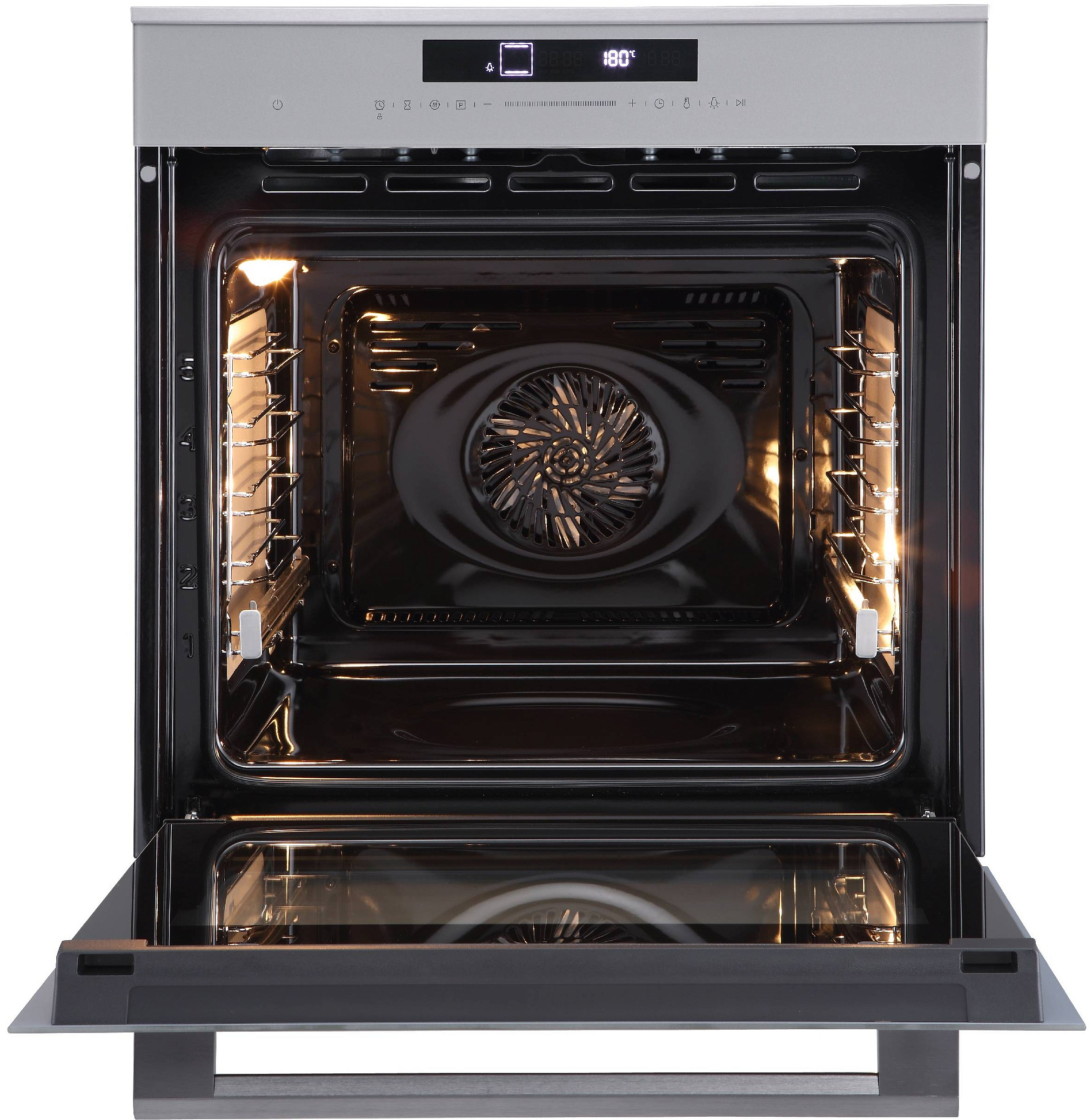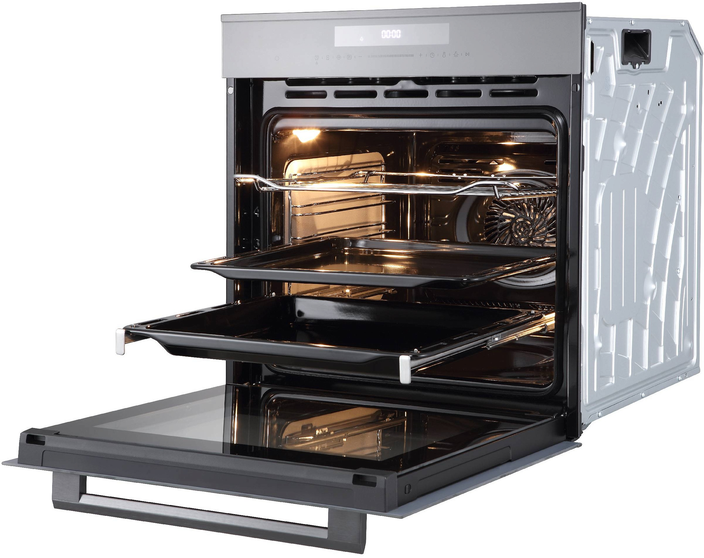 Универсальная рабочая камера объёмом 72 литра предлагает много места для больших блюд и нескольких противней одновременно, а компактные внешние габариты 59,5×59,5×56,5 см вписываются в стандартную нишу 60×56×55 см для встраивания. Телескопические направляющие на одном уровне позволяют легко вынимать тяжёлые противни, а глубокий противень и хромированная решётка входят в комплект, обеспечивая готовность к любым сценариям запекания. Доводчик дверцы добавляет удобства при частом использовании — мягкое и бесшумное закрытие предотвращает вибрации и повышает безопасность.