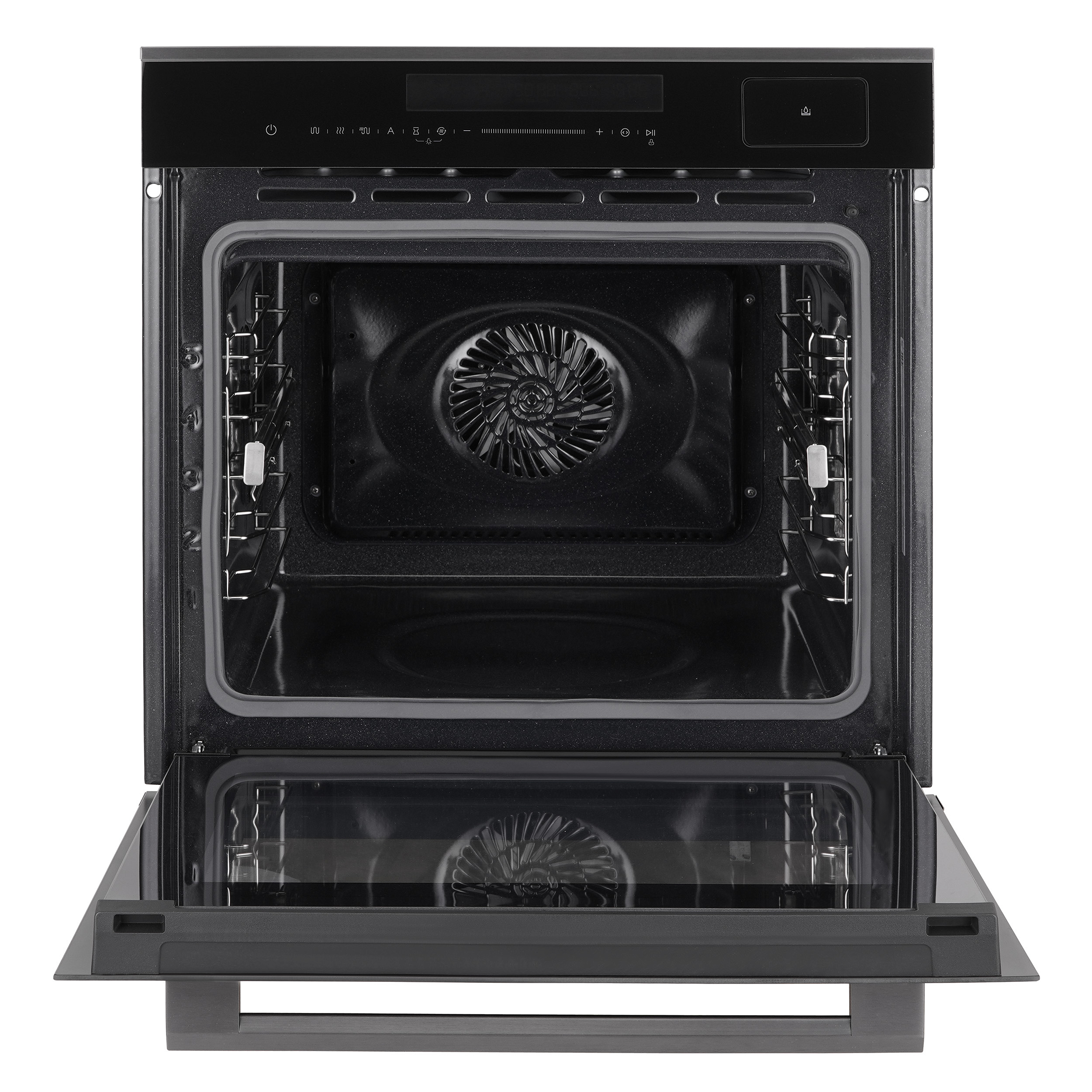 Габариты духовки соответствуют стандартам для встраиваемой техники, что обеспечивает лёгкую интеграцию в кухонные модули. Объём рабочей камеры составляет 71 литр — этого достаточно для одновременного приготовления нескольких блюд или крупной выпечки. Устройство относится к категории электрических однокамерных шкафов с функцией парогенерации.