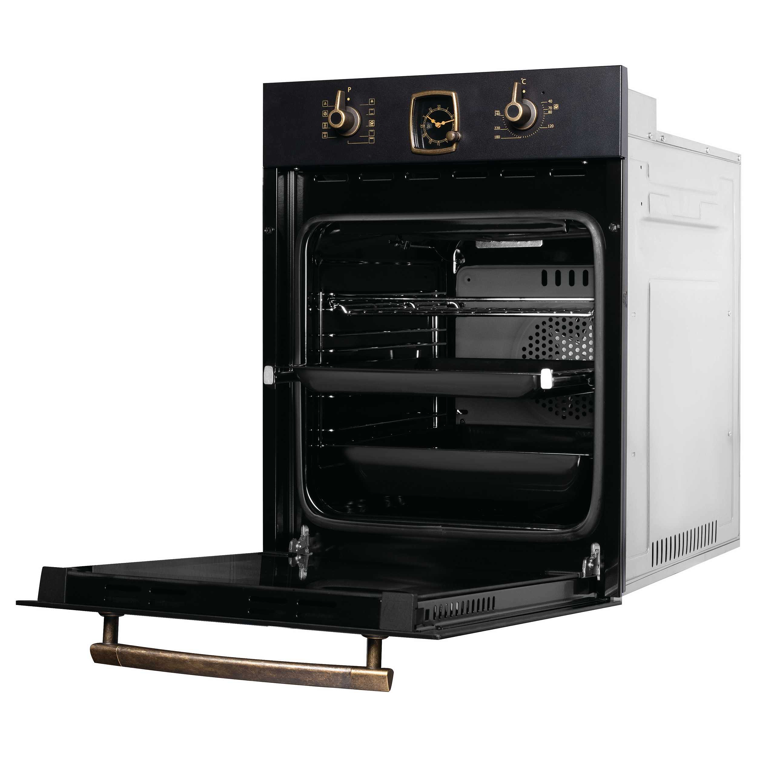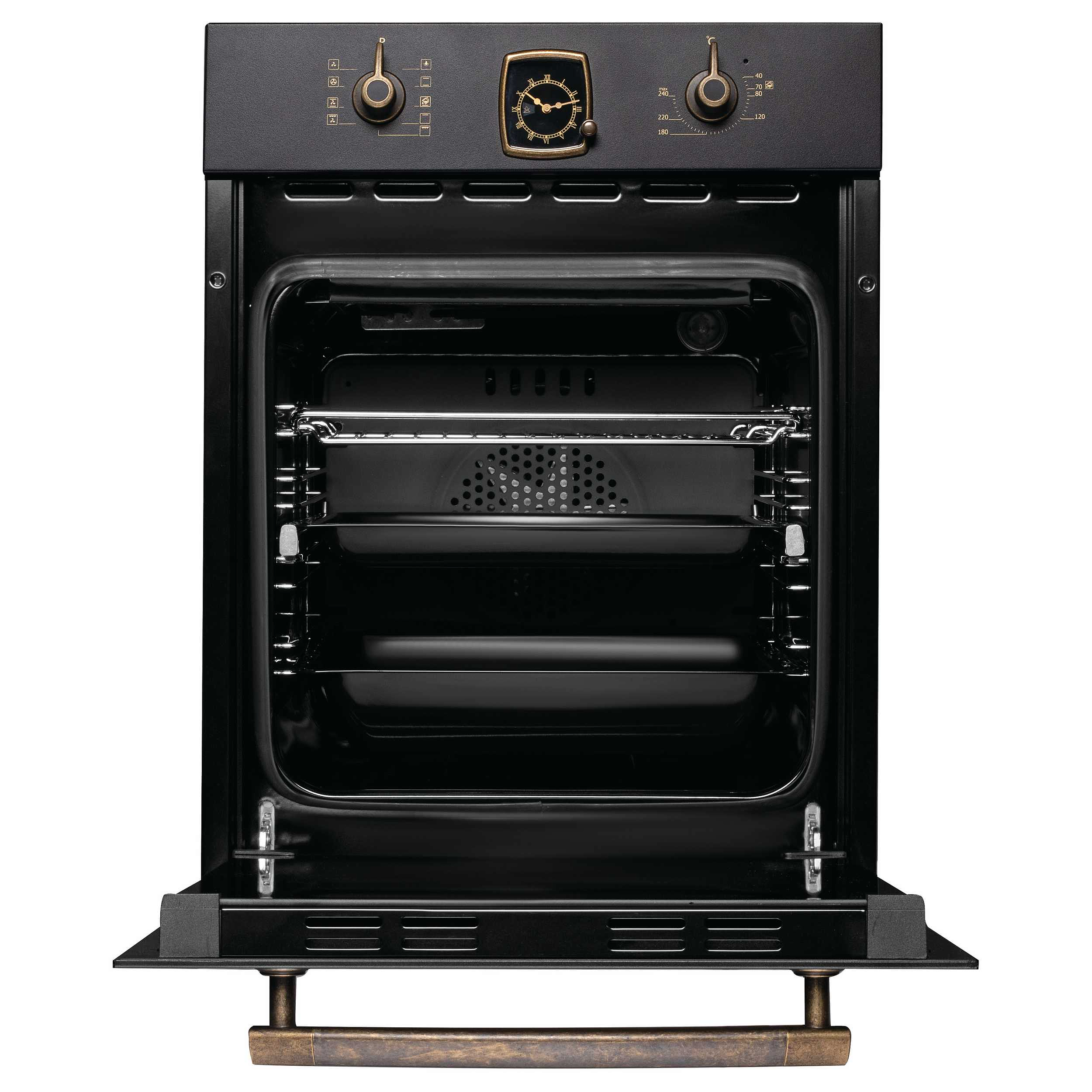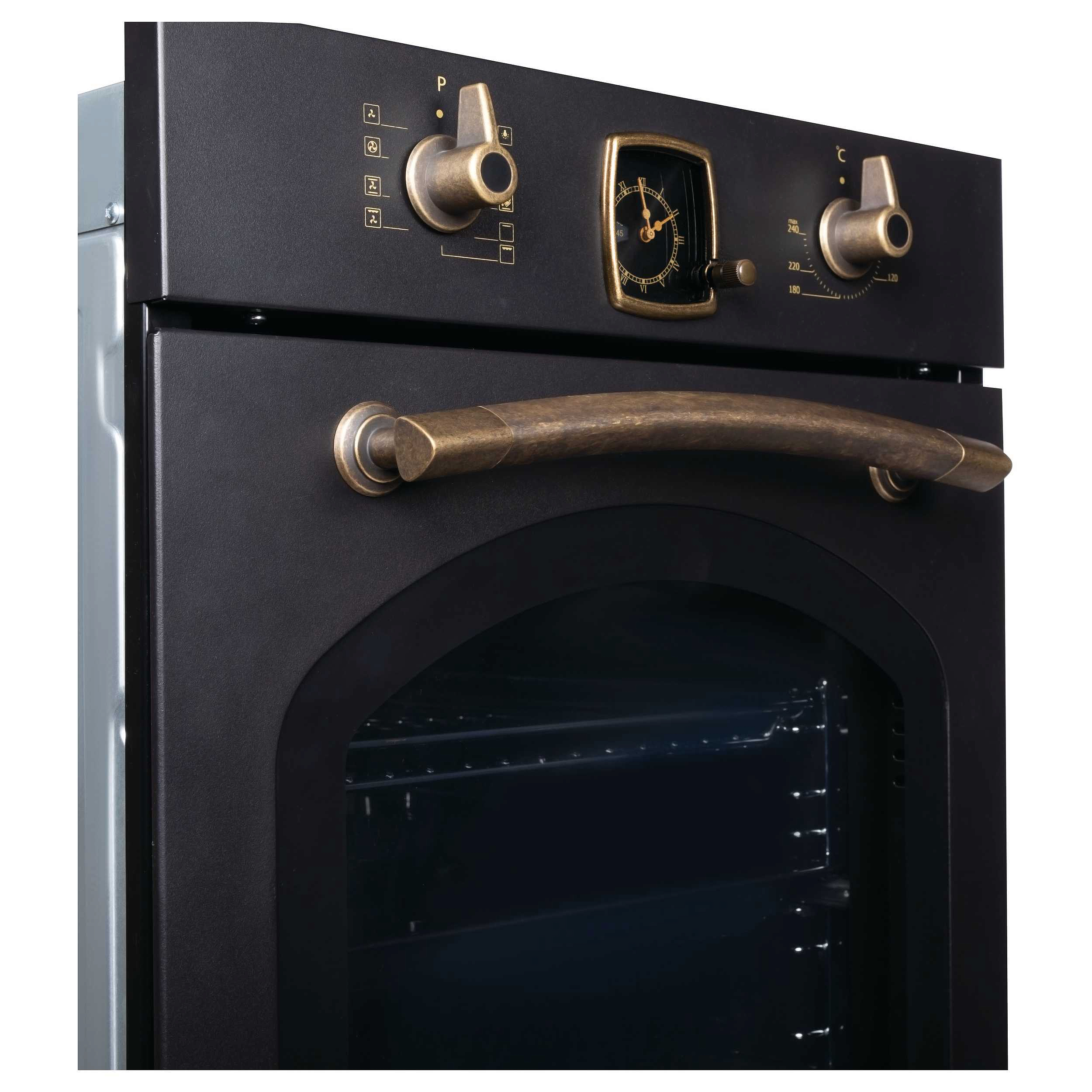 Духовой шкаф — это компактная встраиваемая модель шириной 45 см, созданная для тех, кто ценит функциональность без ущерба для эстетики. Чёрный фасад в сочетании с бронзовой фурнитурой и металлическим шильдом придаёт устройству благородный, но сдержанный вид, легко вписывающийся как в современные, так и в классические интерьеры. Габариты корпуса позволяют установить шкаф в нишу размером 60×41,5×55 см, а внутренний объём в 45 литров обеспечивает достаточно места для семейных блюд и стандартной посуды.