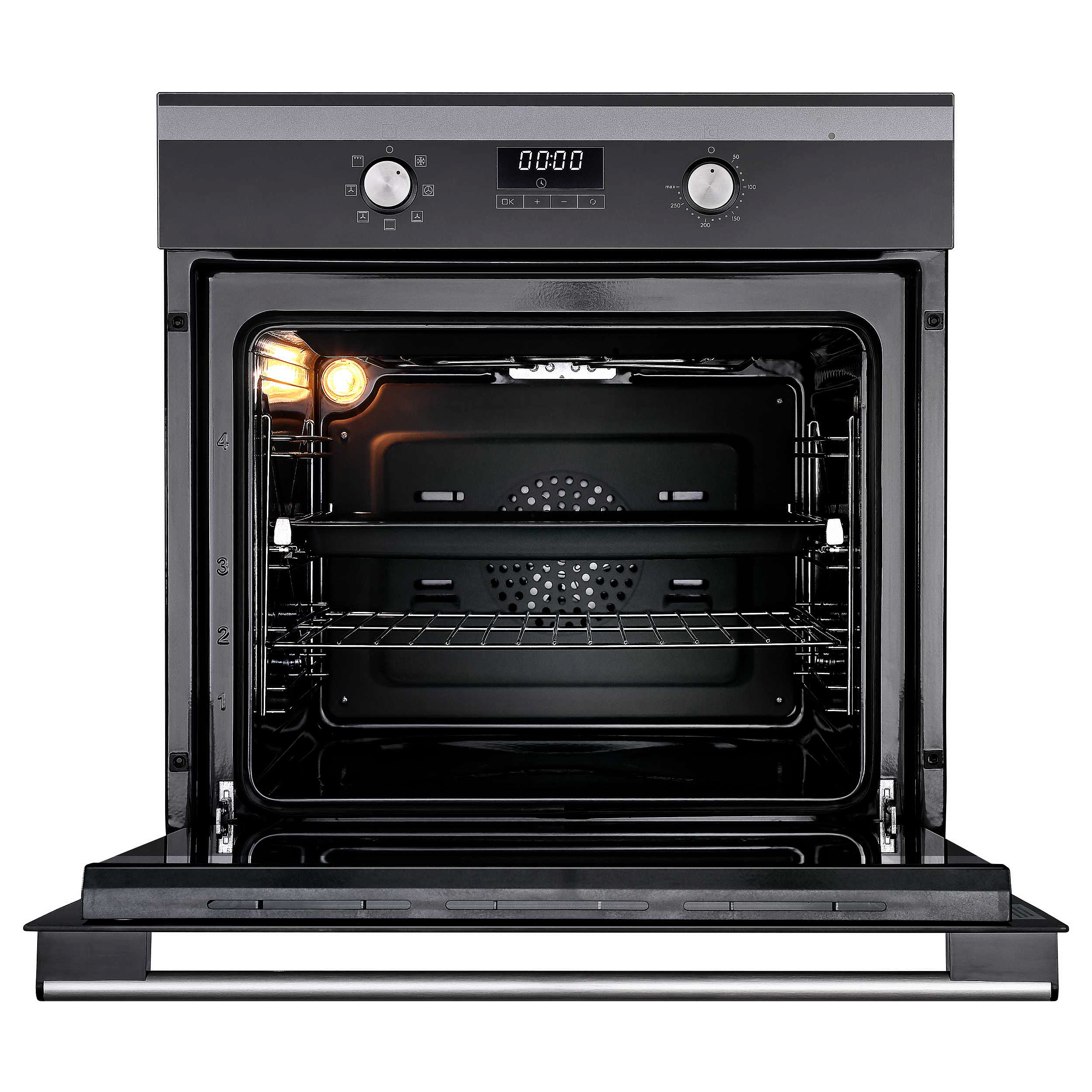 Независимый духовой шкаф OKB 771 CFW c фронтальной поверхностью из черного стекла оснащен грилем и конвекцией, что в сочетании с верхним и нижним нагревом дает возможность приготовления большого количества разнообразных блюд. Поворотные регуляторы утапливаются и фиксируются внутри панели управления, это исключает случайное изменение настроек и создает удобства при уходе.