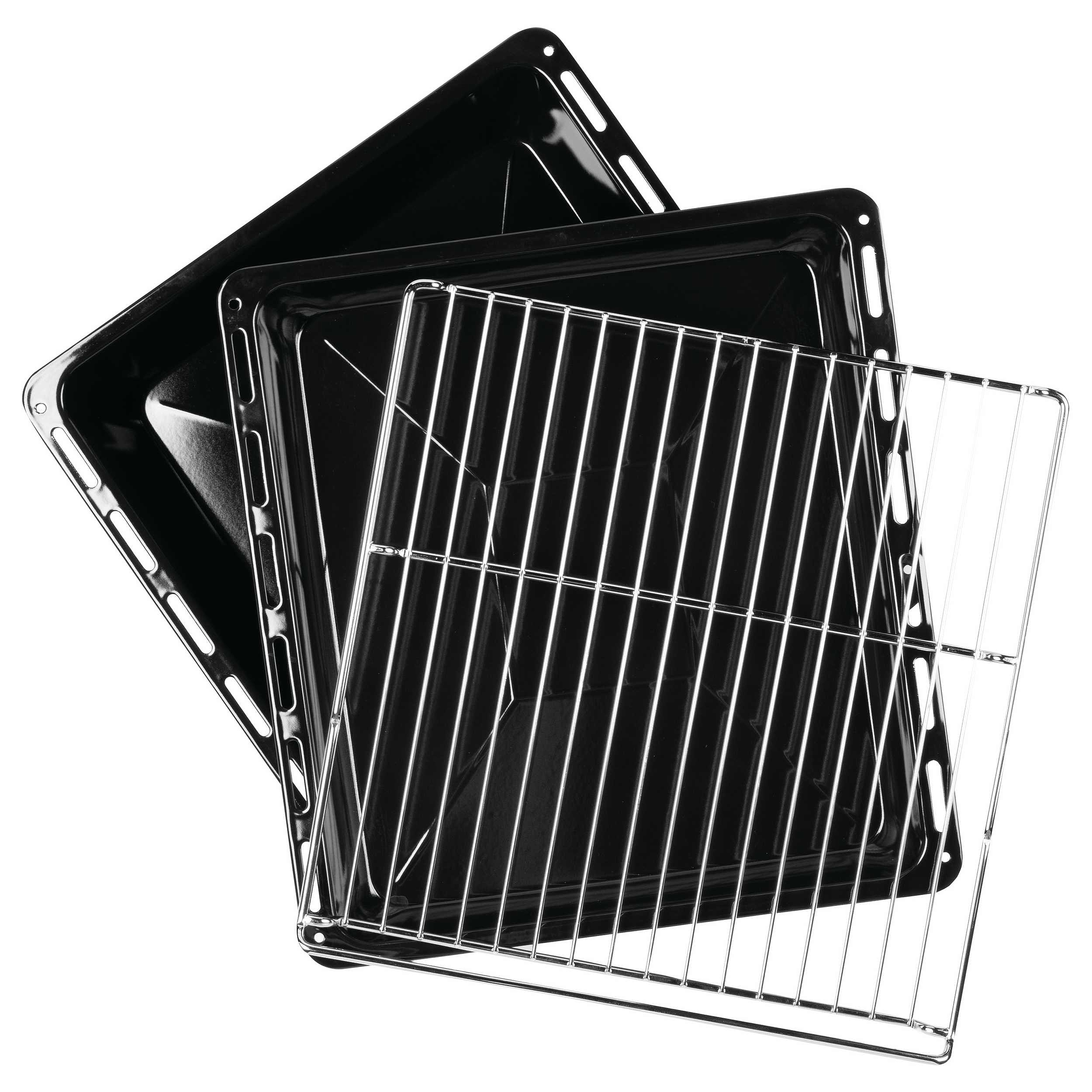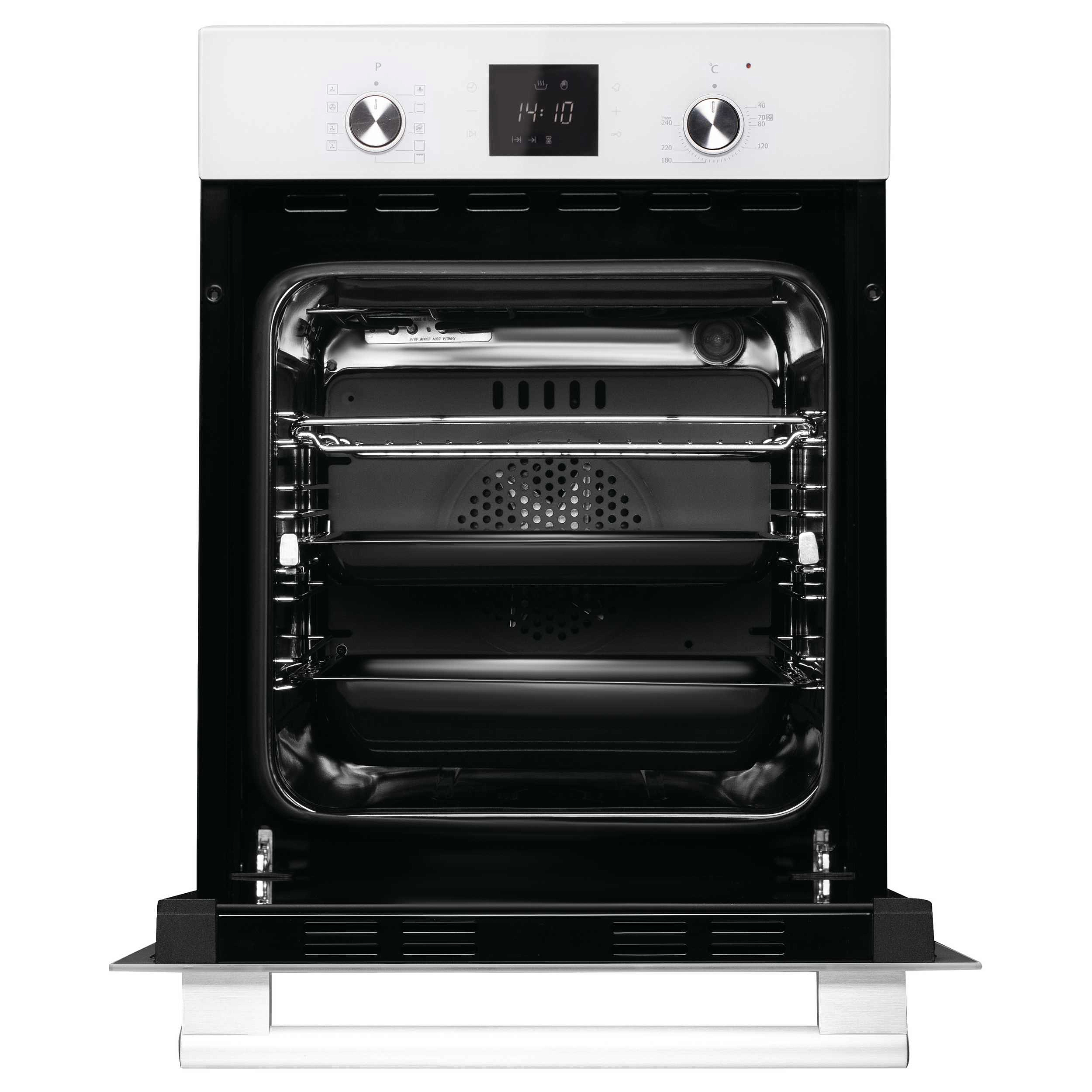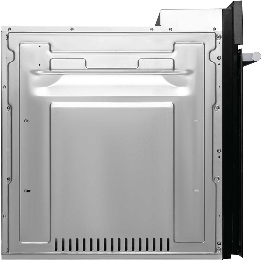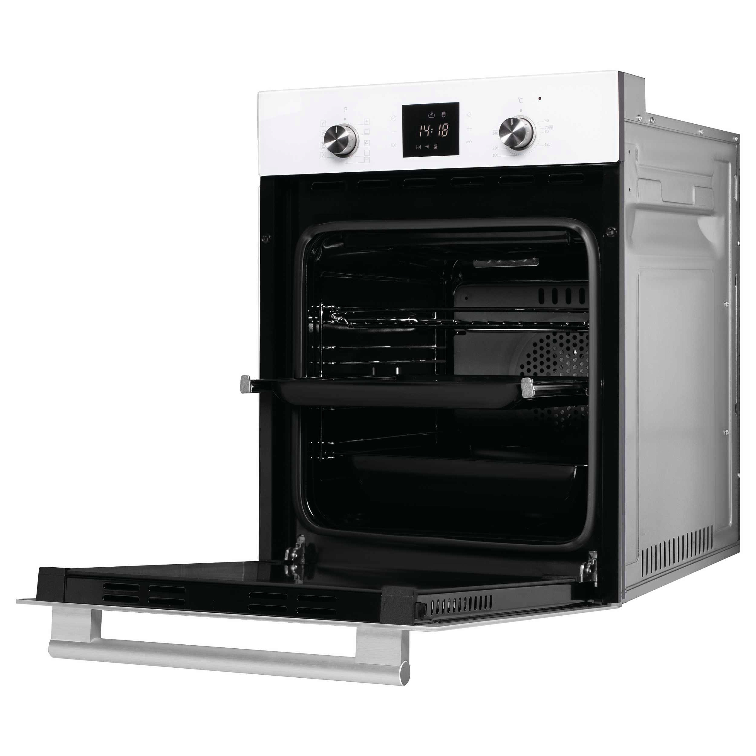 Внутри предусмотрено четыре уровня для установки посуды, а телескопические направляющие на одном уровне облегчают извлечение противней. В комплект входят хромированная решётка, плоский и глубокий противни — всё необходимое для начала готовки сразу после установки. Нагревательные элементы работают в различных комбинациях: доступны традиционный нагрев, конвекция, большой гриль и турбогриль для получения хрустящей корочки без пересушивания. Также предусмотрен режим разморозки с помощью вентилятора без активации ТЭНов, что бережно размораживает продукты.