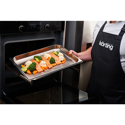 Дисплей, которым оснащен современный духовой шкаф Кортинг OKB 8101N STEAM, способен отображать информацию не только в цифровом или буквенном виде, но и в символьном, в графическом. Электронное управление включает в себя два утапливаемых и несколько сенсорных переключателей. Такой тип управления — это не только достижение результата легким касанием руки, это надежность, так как сенсорные панели укрывают электронику от внешних загрязнений. А также это точность настроек, поскольку чувствительные датчики улавливают едва заметные перемещения пальцев.