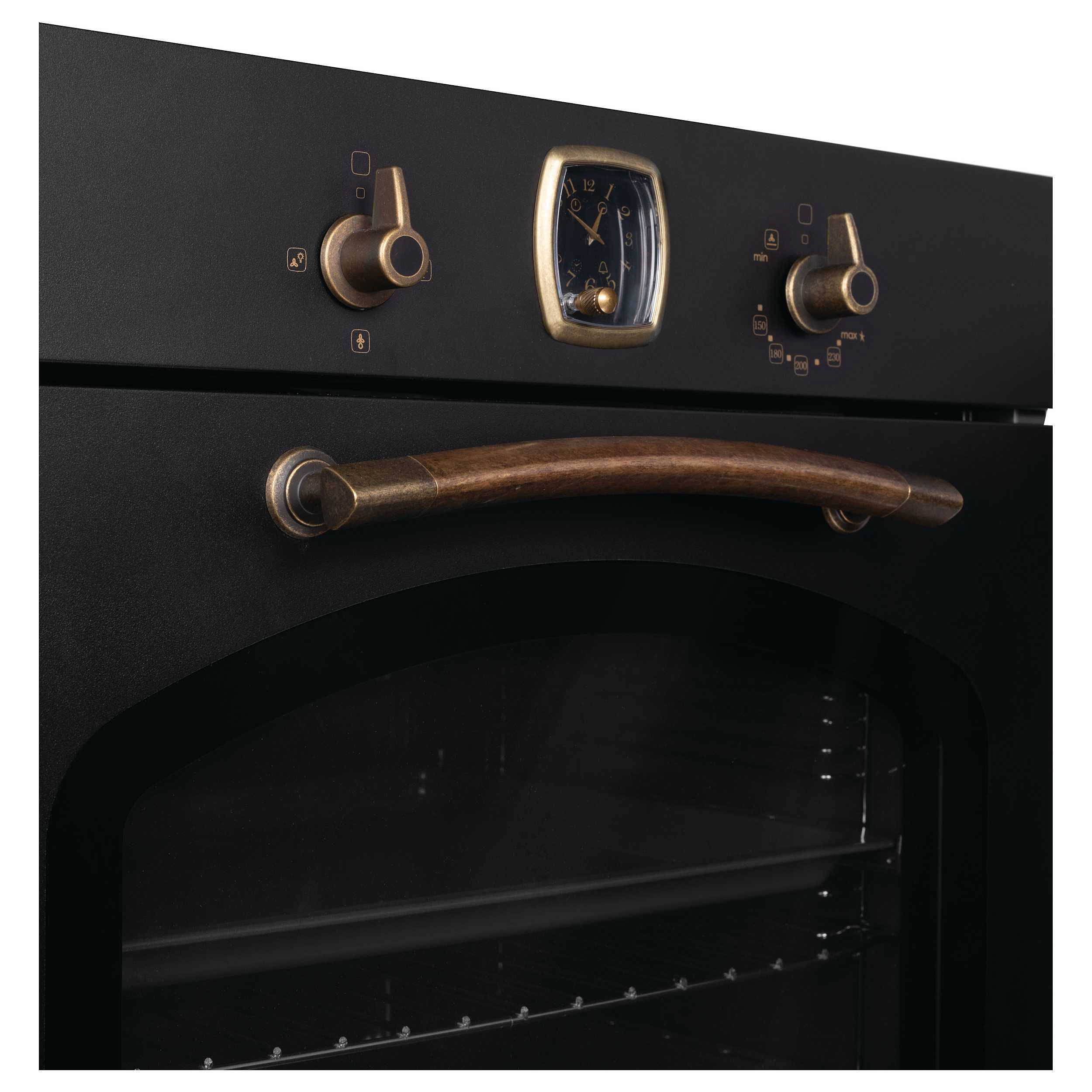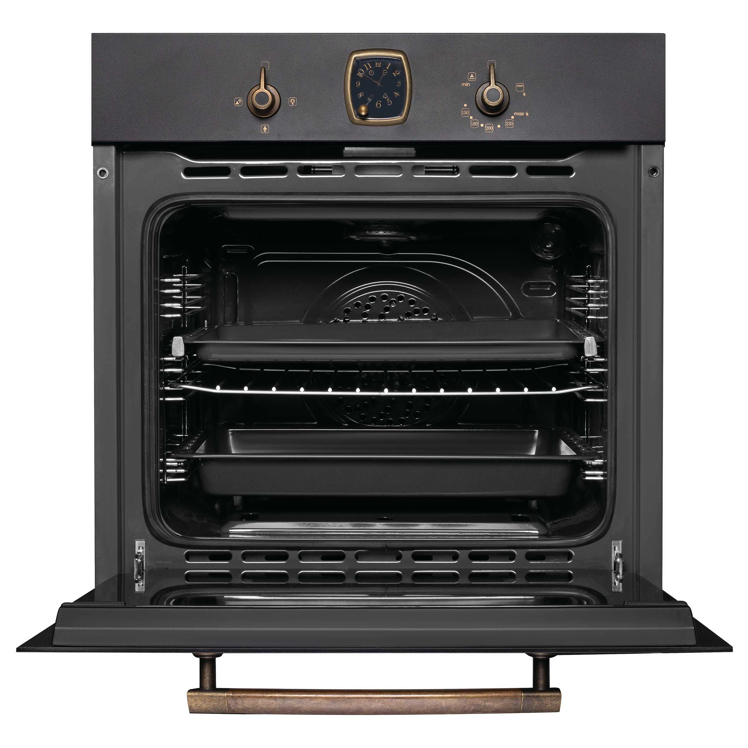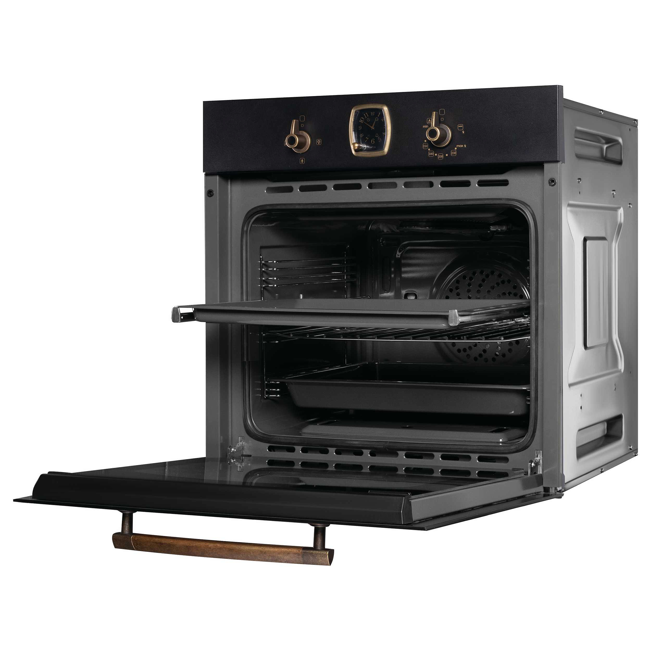 Духовка серии Calabria выполнена в элегантном черном цвете с элементами бронзовой фурнитуры. Матовое покрытие корпуса устойчиво к появлению отпечатков пальцев и царапин, что значительно облегчает уход за поверхностью. Такое решение особенно актуально для современных кухонь, где важно поддерживать безупречный внешний вид техники.