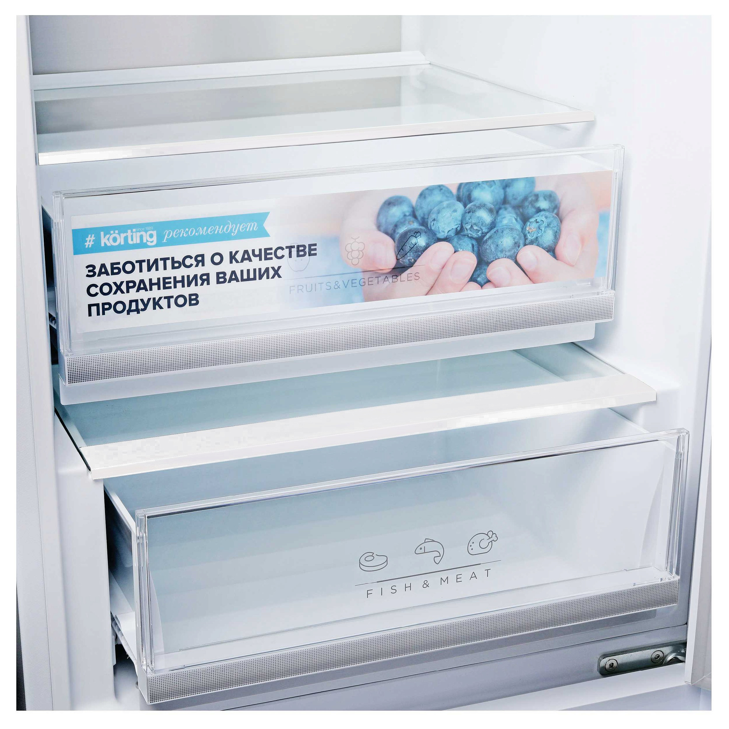 Морозильное отделение оборудовано тремя пластиковыми ящиками, что позволяет удобно сортировать замороженные продукты и быстро находить нужные. Лоток для приготовления кубиков льда добавляет комфорта и удобства в повседневное использование. Оба отделения оснащены системой No Frost, которая предотвращает образование наледи и инея, что исключает необходимость ручного размораживания и поддерживает оптимальные условия хранения. Размораживание в холодильном отделении происходит автоматически, благодаря динамической системе охлаждения, которая равномерно распределяет холод и поддерживает стабильную температуру.