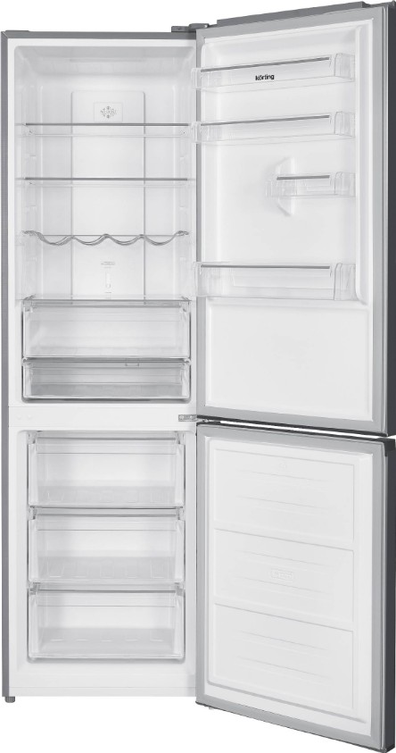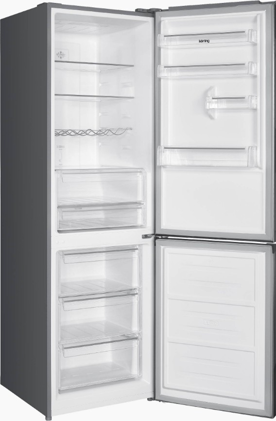 Общий объём составляет 342 л, из которых 245 л приходится на холодильную камеру, а 97 л — на морозильную. Внутри всё продумано для комфорта: три прочные стеклянные полки, контейнер с контролем влажности для овощей и фруктов, отдельная полка под бутылки и держатель для яиц. В нижнем отсеке — лоток для льда и функция Super Freeze, которая быстро замораживает свежие продукты, сохраняя их структуру и вкус. Обе камеры работают по технологии No Frost — лёд не образуется, а ручная разморозка не требуется.