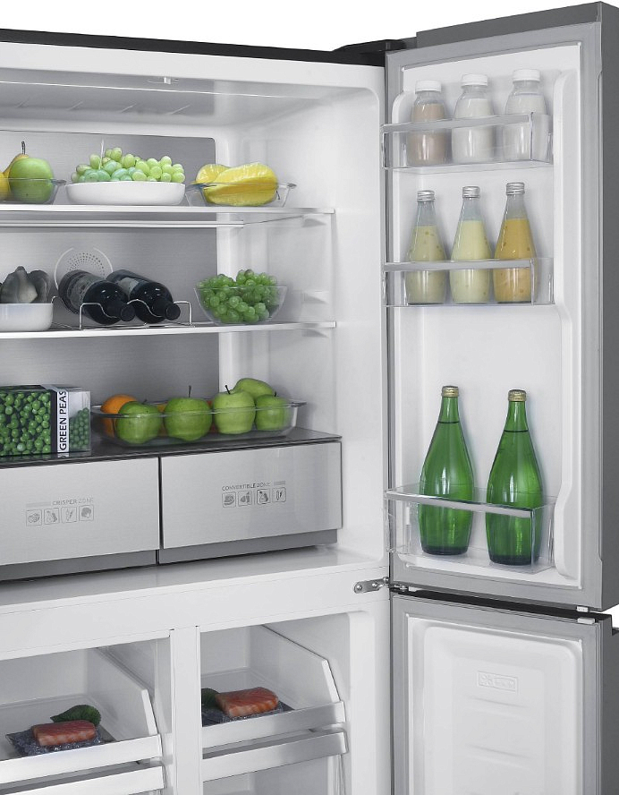 Внутренняя организация продумана до деталей: три прочные стеклянные полки, шесть дверных секций для банок и бутылок, отдельная полка под напитки, контейнер для яиц и специальный ящик для овощей и фруктов с поддержкой оптимальной влажности. Морозильная камера внизу оснащена двумя вместительными пластиковыми ящиками и лотком для льда. Функция Super Freeze быстро снижает температуру после загрузки свежих продуктов, фиксируя их свежесть. Технология No Frost работает в обеих зонах, полностью исключая образование инея и необходимость ручной разморозки. Инверторный компрессор в паре с экологичным хладагентом R600a обеспечивает тихую, стабильную и энергоэффективную работу — класс A++ подтверждает низкое потребление. Задняя стенка с технологией Cold Metal способствует равномерному распределению холода по всему объёму.