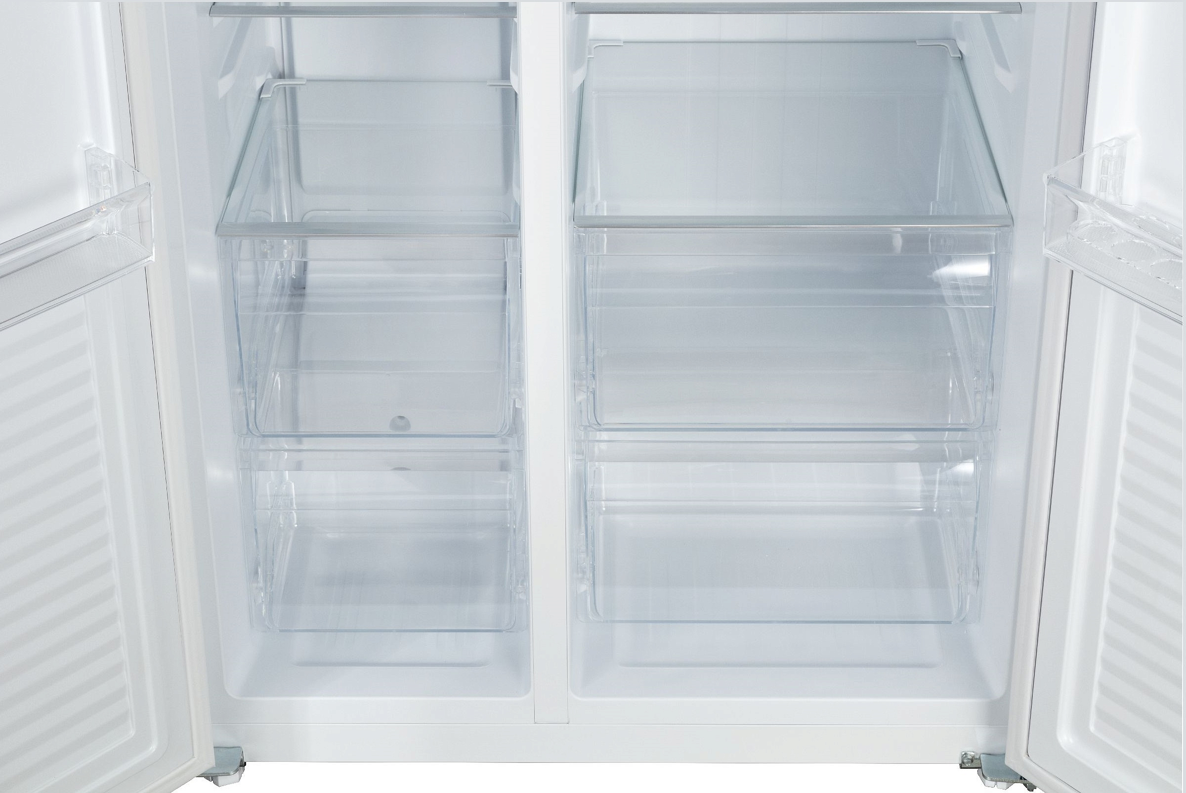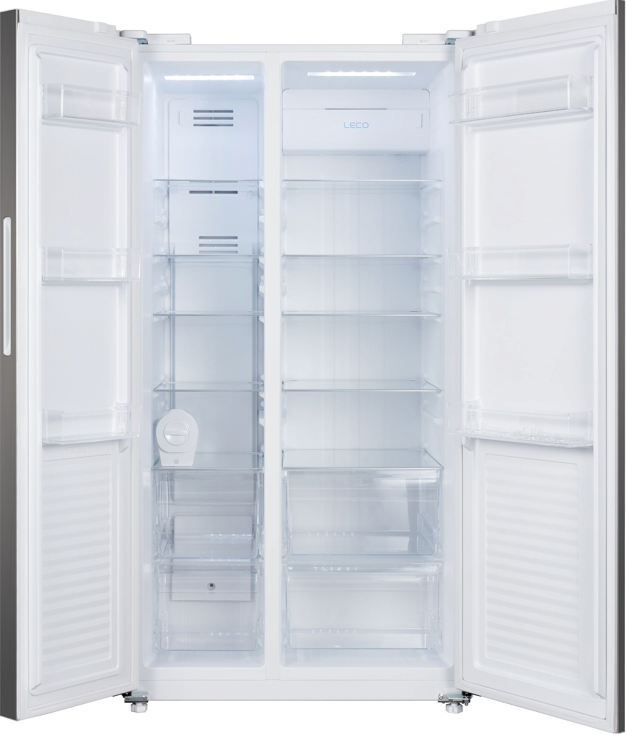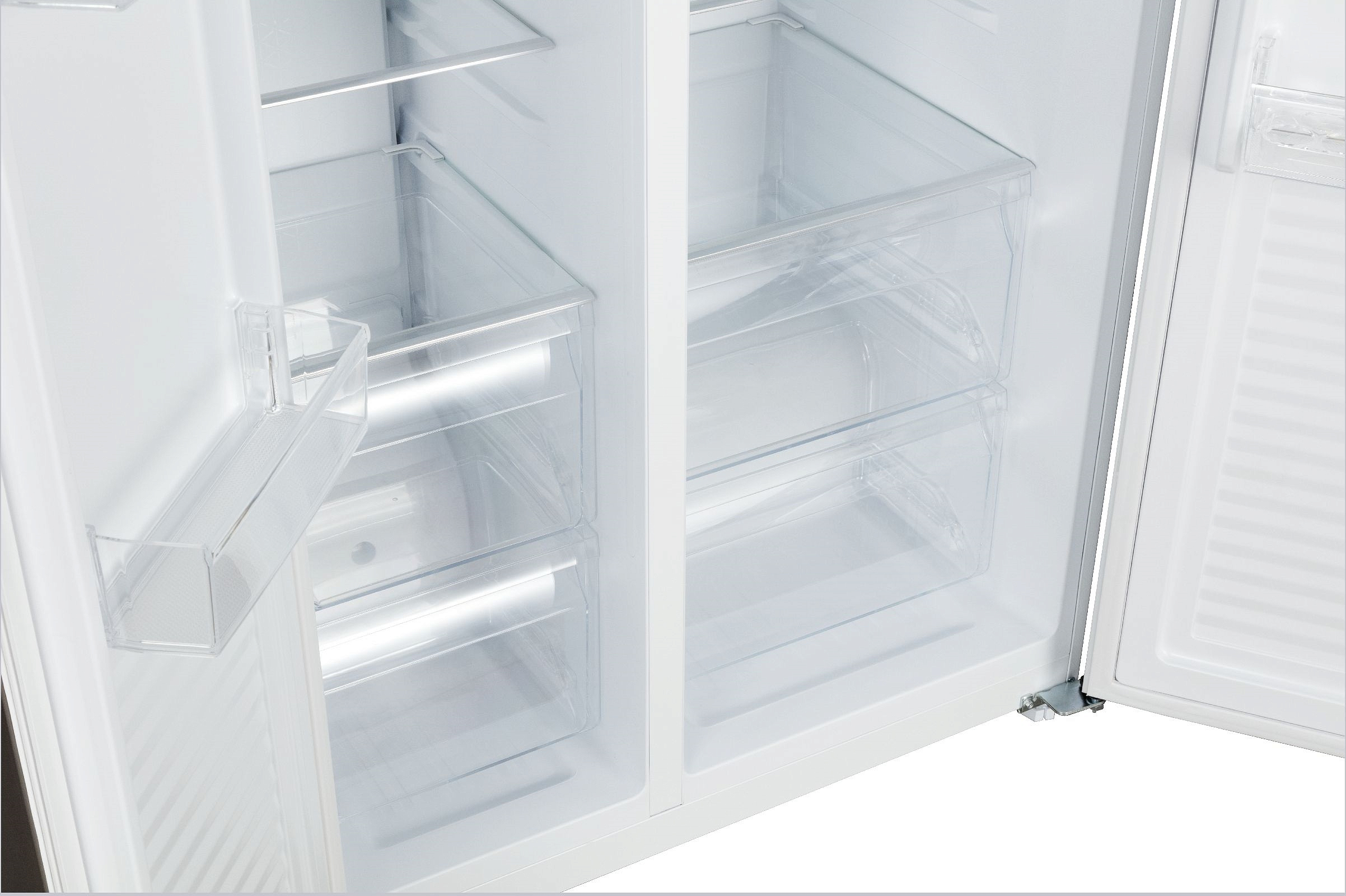 Общий полезный объём составляет 559 литров: холодильная камера вмещает 373 л, морозильная — 186 л. Внутри всё продумано до мелочей: четыре прочные стеклянные полки, три прозрачных контейнера с контролем влажности для овощей и фруктов, подставка под яйца и три дверные полки упрощают организацию повседневных запасов. В морозилке — пять выдвижных пластиковых ящиков и лоток для льда, что делает хранение морозильных продуктов удобным и упорядоченным. Равномерная LED-подсветка обеспечивает отличную видимость на всех уровнях.