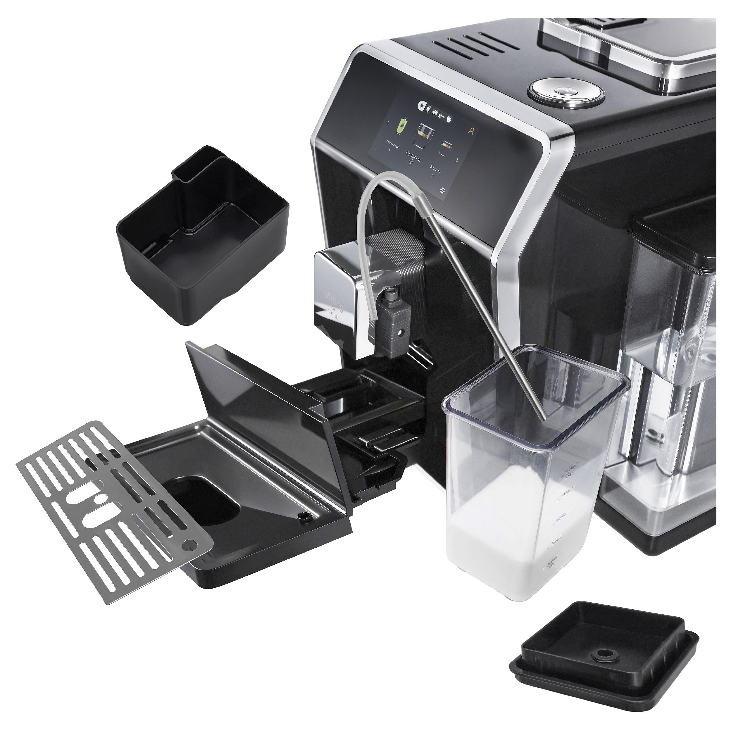 Кофемашина — это элегантное сочетание чёрного корпуса и нержавеющей стали, где матовые и глянцевые поверхности создают современный, но сдержанный образ. Компактные габариты (36×31×44 см) позволяют разместить её на любой столешнице, в кухонном углу или даже на барной стойке без ощущения загромождённости. Управление полностью сенсорное: интуитивный экран реагирует на лёгкое касание, а интерфейс продуман так, чтобы выбрать напиток можно было за секунды. Все ключевые элементы — бункер для зерен (150 г), резервуар для воды (1,5 л) и контейнер для молока (500 мл) — легко снимаются для заправки и очистки. В комплекте также предусмотрены регулируемые поддоны и удобная площадка под кофейник.