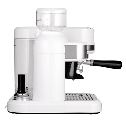 Это компактная кофейная станция в белом корпусе с элементами из нержавеющей стали, сочетающая эстетику и продуманную функциональность. Её габариты — 40×31×32 см — позволяют разместить устройство даже на небольшой столешнице, не нарушая порядка, а вес в 6,1 кг обеспечивает устойчивость во время работы. Управление реализовано через сенсорный дисплей: настройка температуры, объёма напитка, активация таймера или режима двойной подачи — всё это доступно интуитивно, без сложных меню. Встроенная жерновая кофемолка мелет зёрна непосредственно перед завариванием, раскрывая свежесть аромата, а регулировка объёма воды помогает точно контролировать крепость и размер порции. Ручной капучинатор типа Панарелло даёт полный контроль над плотностью и текстурой молочной пены — идеально для капучино, латте и других молочных напитков. Функция одновременного приготовления двух чашек особенно удобна утром или при приёме гостей. Отдельная подача горячей воды расширяет возможности — чай, американо или бульон готовятся без переключения режимов. Подогрев чашек сохраняет температуру напитка, усиливая вкус и аромат. Автоматическая декальцинация и защита от перегрева с автоотключением повышают безопасность и упрощают уход.