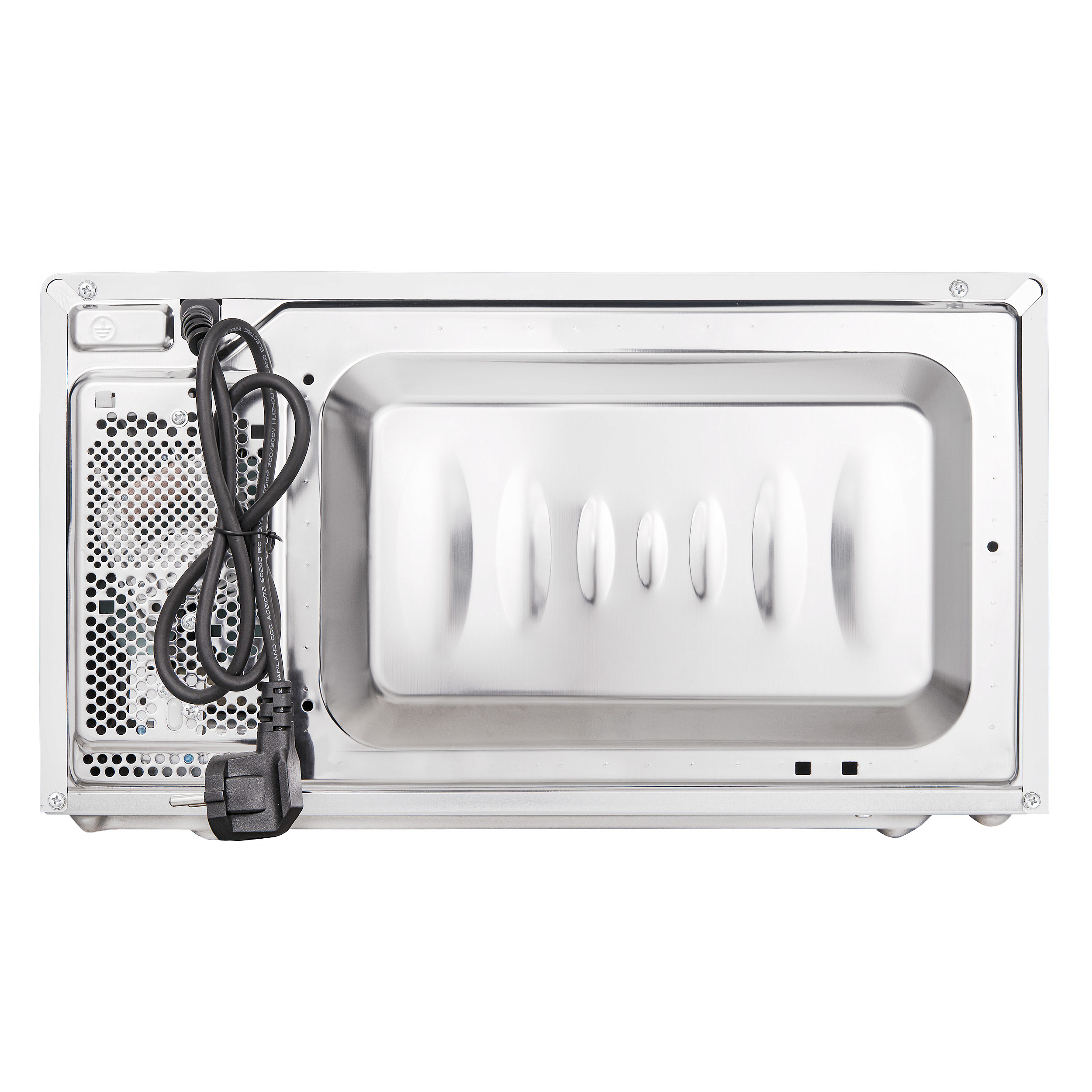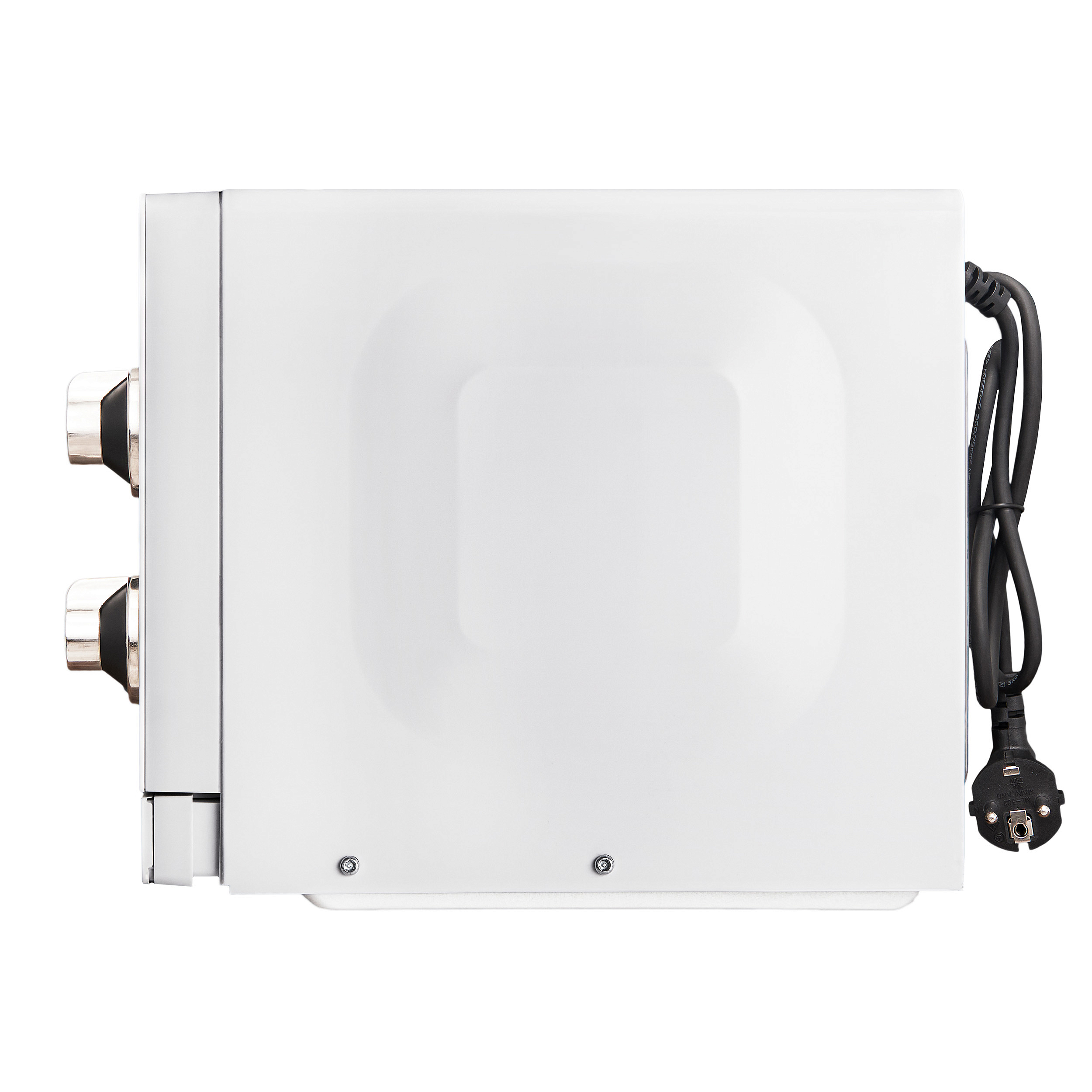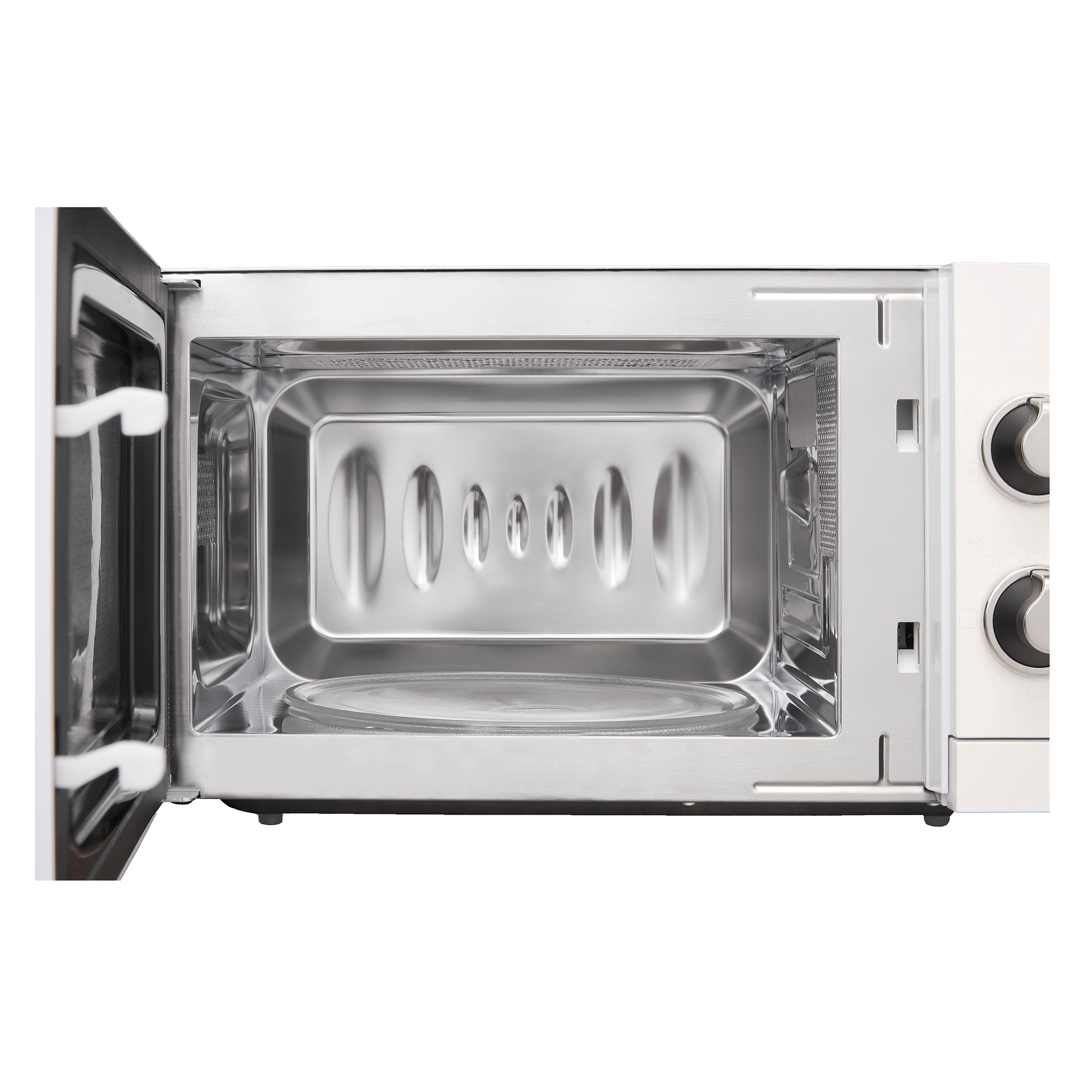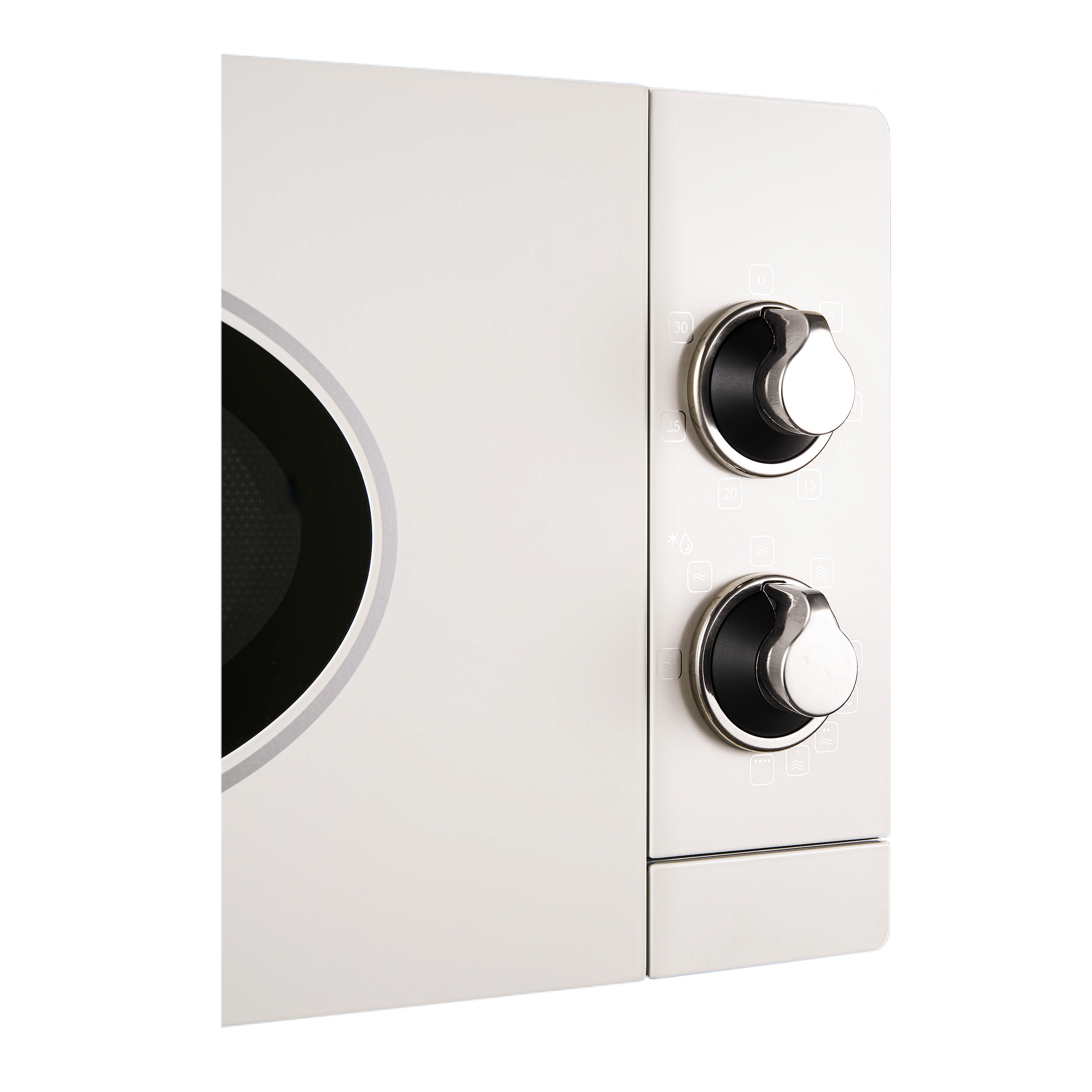 Дизайн микроволновки выполнен в античном белом цвете, который идеально впишется в любой интерьер. Детали фурнитуры выполнены в стильном серебристом цвете, что придает модели современный и элегантный вид. Освещение камеры обеспечивает удобство использования техники в любое время суток. Дверца открывается при помощи кнопки, а ее упор расположен слева, что обеспечивает удобство использования.