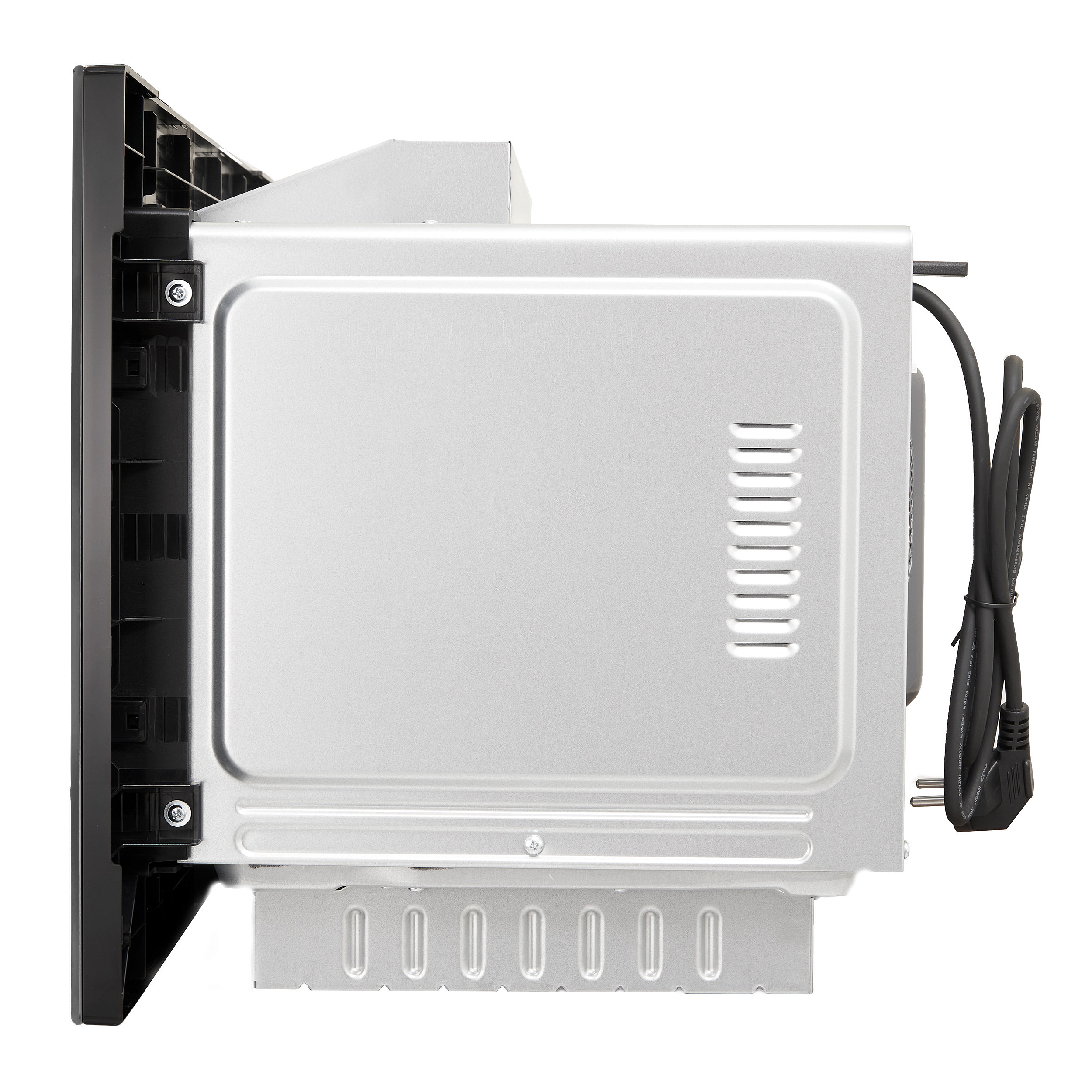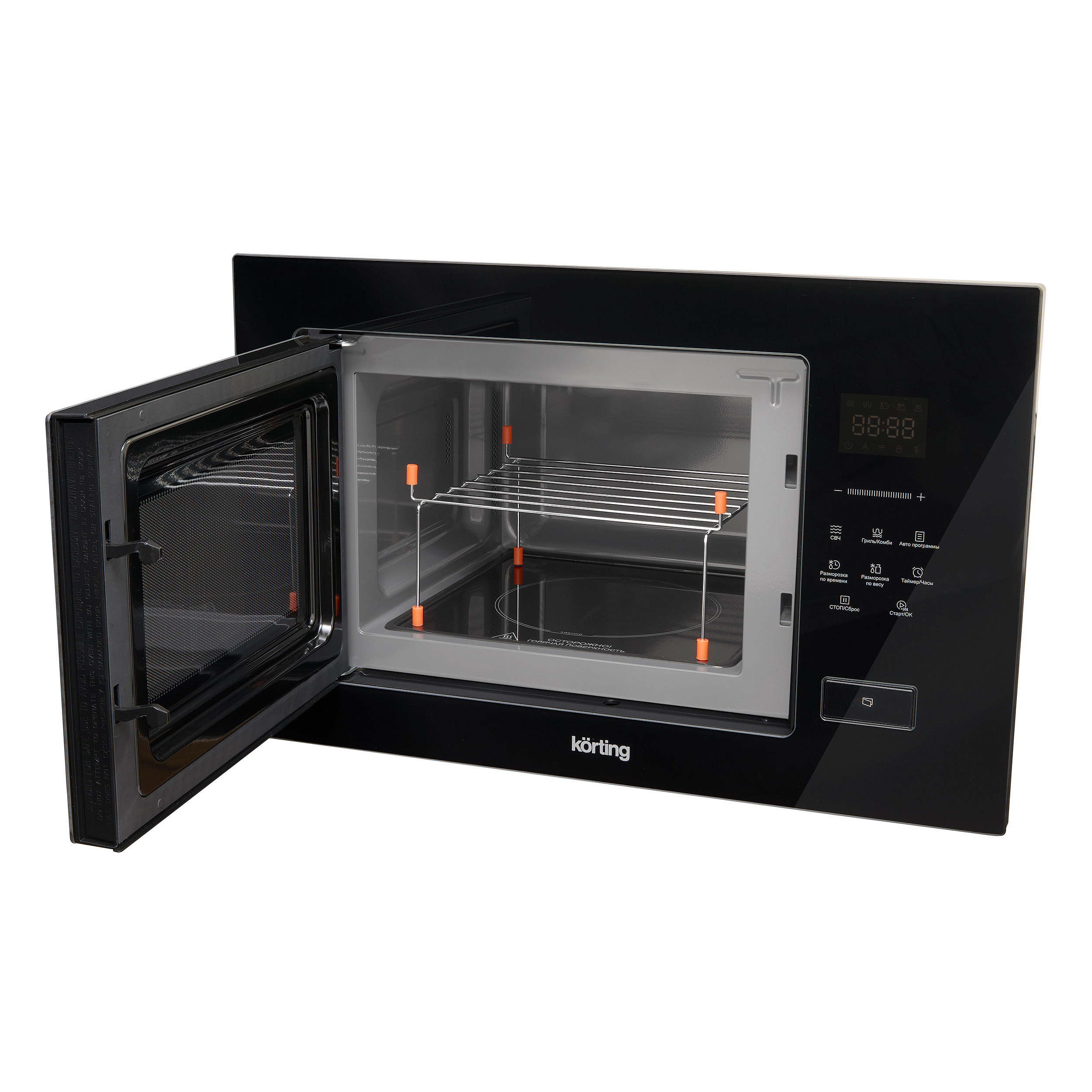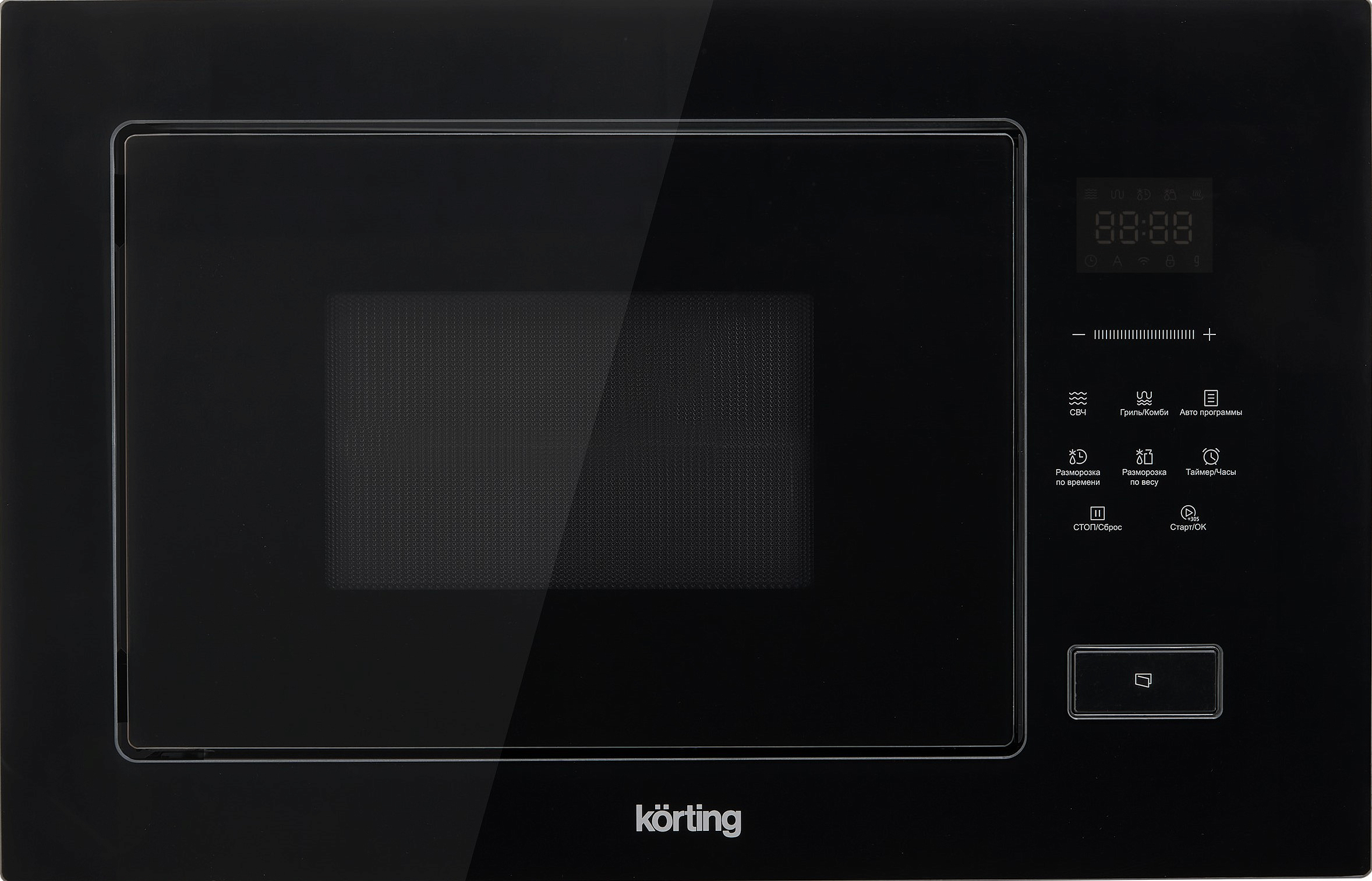 Управление — электронное, с сенсорными кнопками и контрастным дисплеем Cold White. Доступно восемь автоматических программ: Картофель, Мясо, Рыба, Овощи, Паста, Напитки, Подогрев и Попкорн — каждая подбирает оптимальное время и мощность. Есть таймер, часы и функция блокировки от детей, исключающая случайные нажатия во время работы.