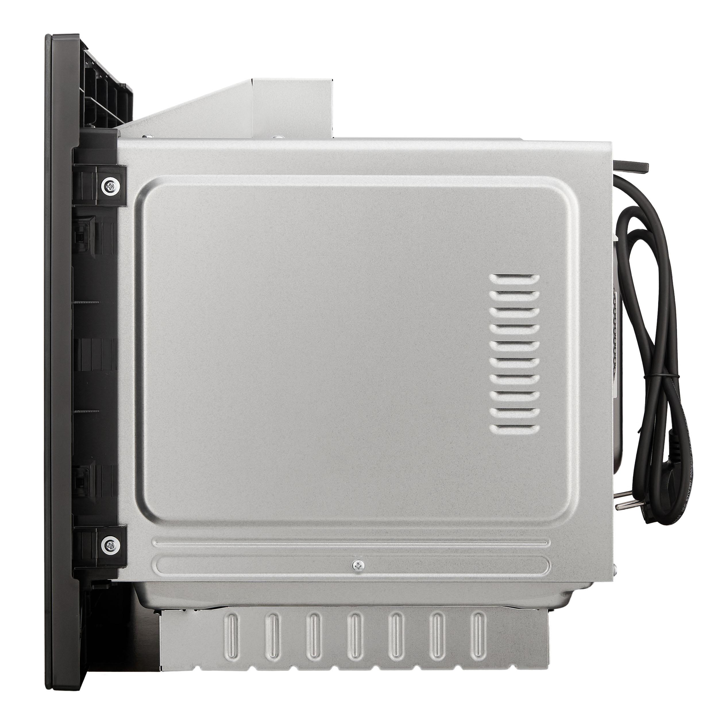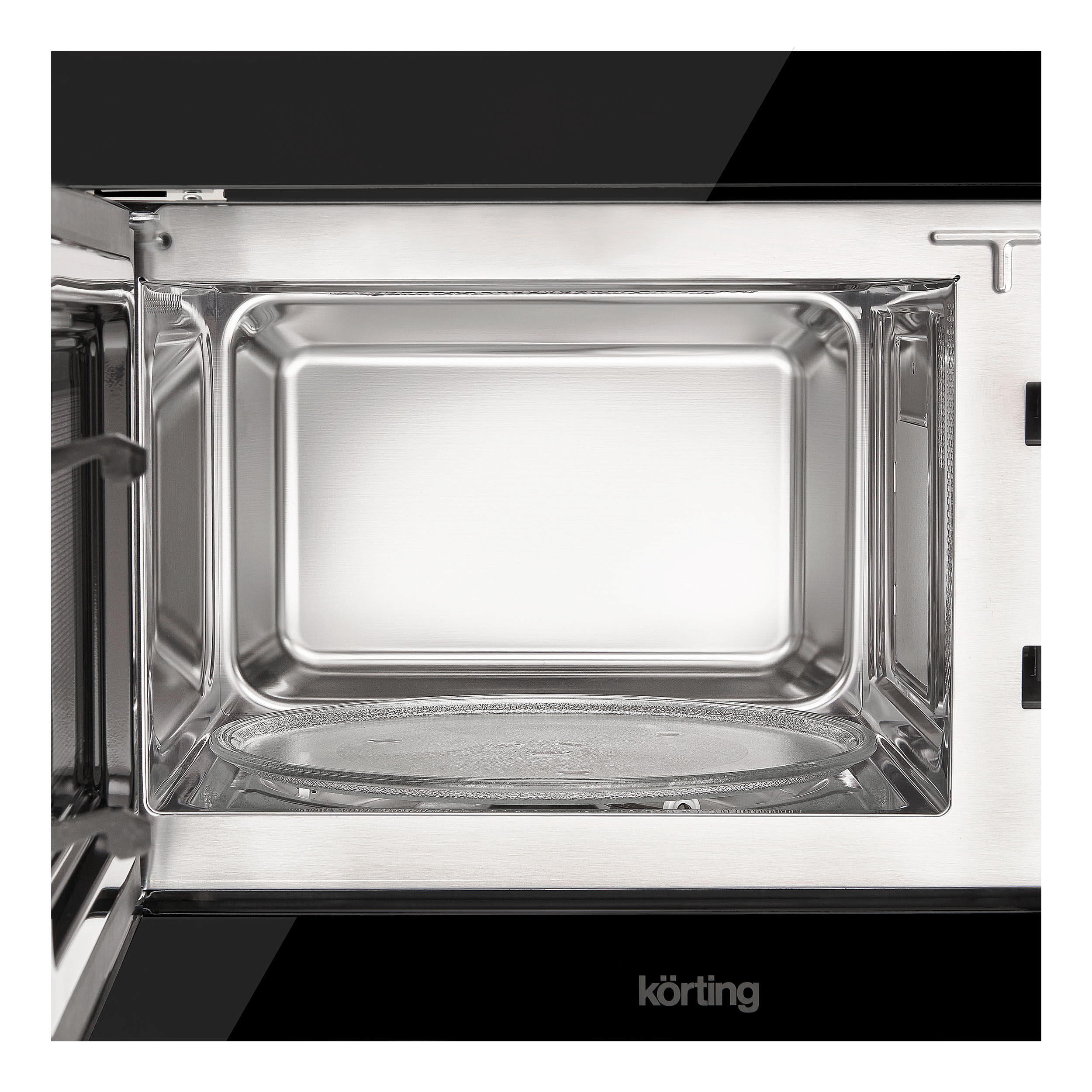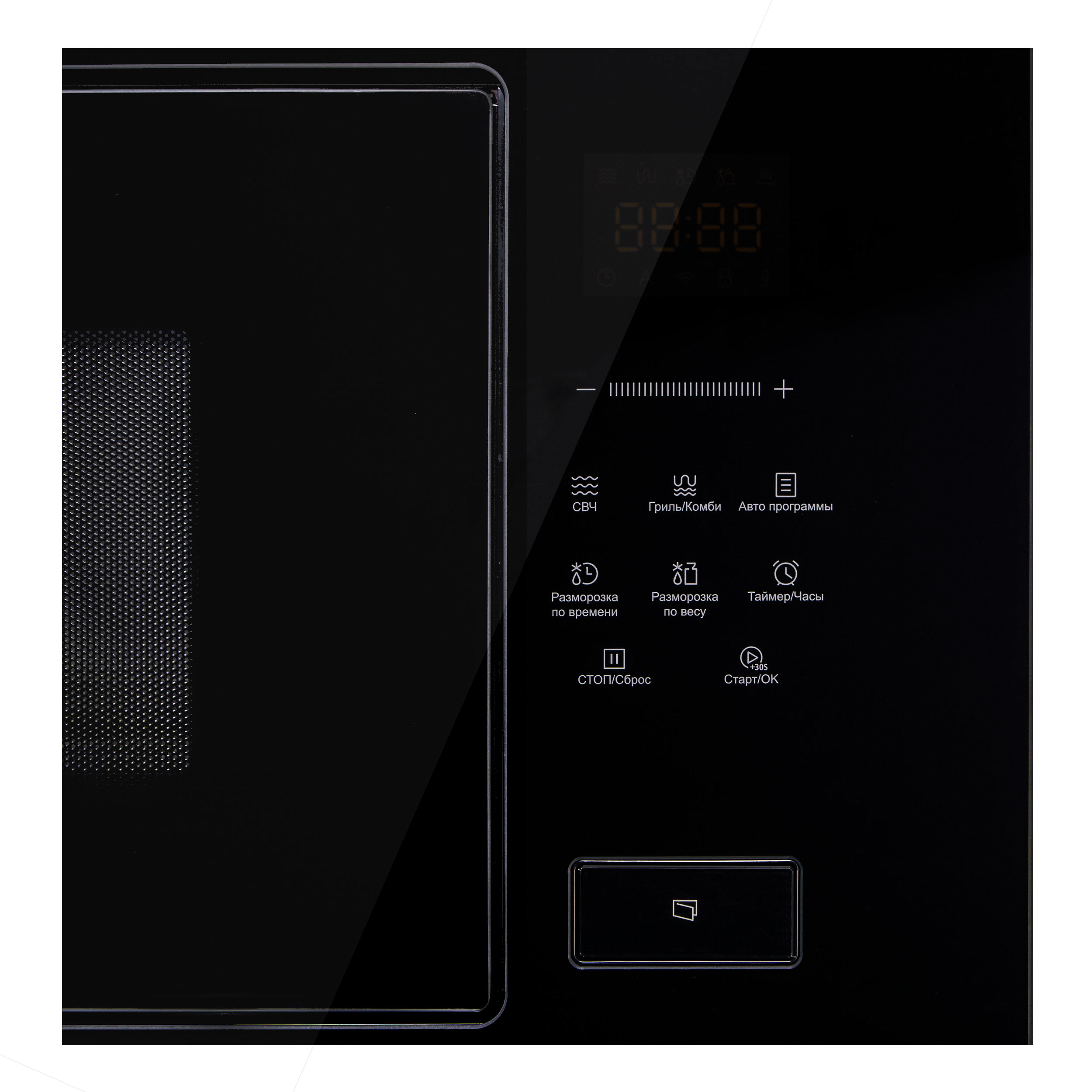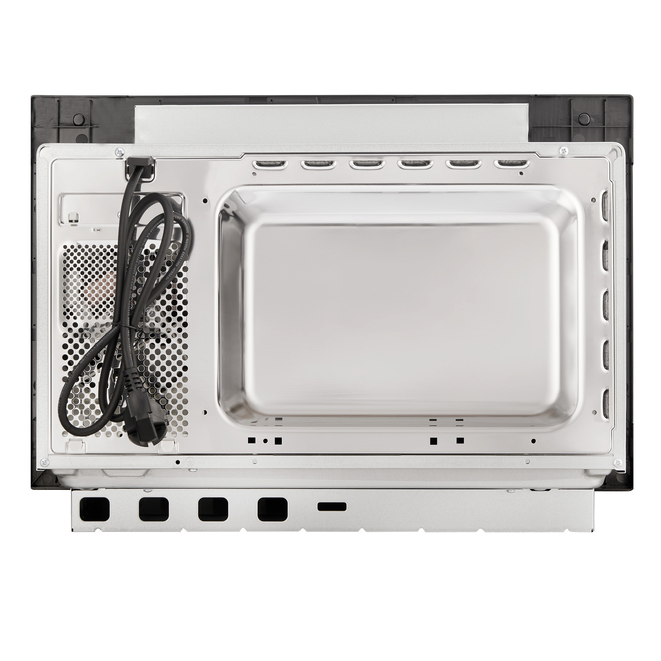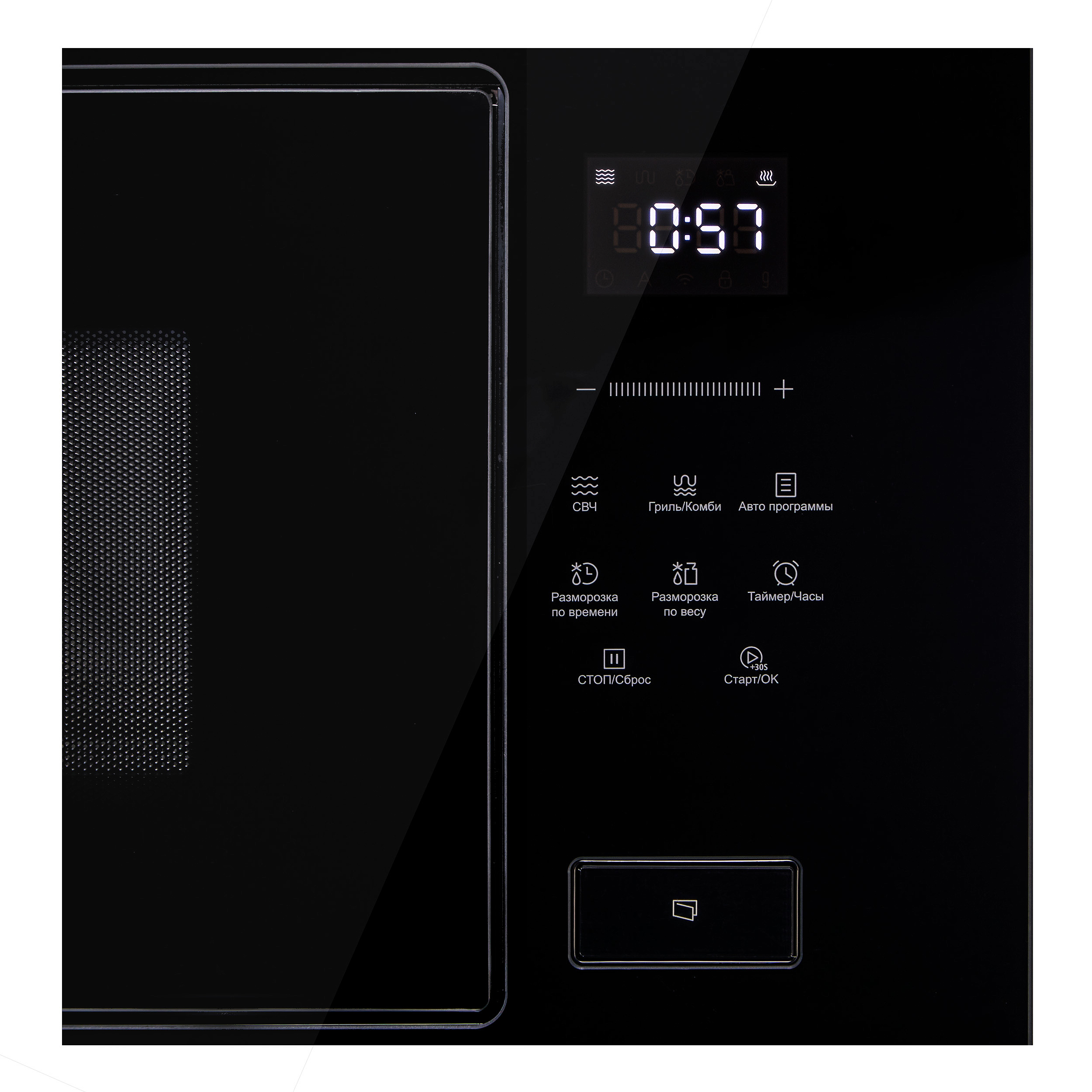 Микроволновая печь — это гармоничное сочетание эстетики и функциональности. Её фронт выполнен из чёрного стекла, дополненного элементами из нержавеющей стали, что создаёт сдержанный, но премиальный образ, легко вписывающийся в любой современный интерьер. Несмотря на компактные внешние габариты, внутренний объём достаточно велик, а для встраивания требуется ниша всего 38×56×50 см — идеально для стандартных кухонных модулей. Камера изготовлена из нержавеющей стали: она не впитывает запахи, легко моется и сохраняет гигиену даже при ежедневном использовании. Встроенная подсветка позволяет чётко видеть процесс приготовления без открывания дверцы.
