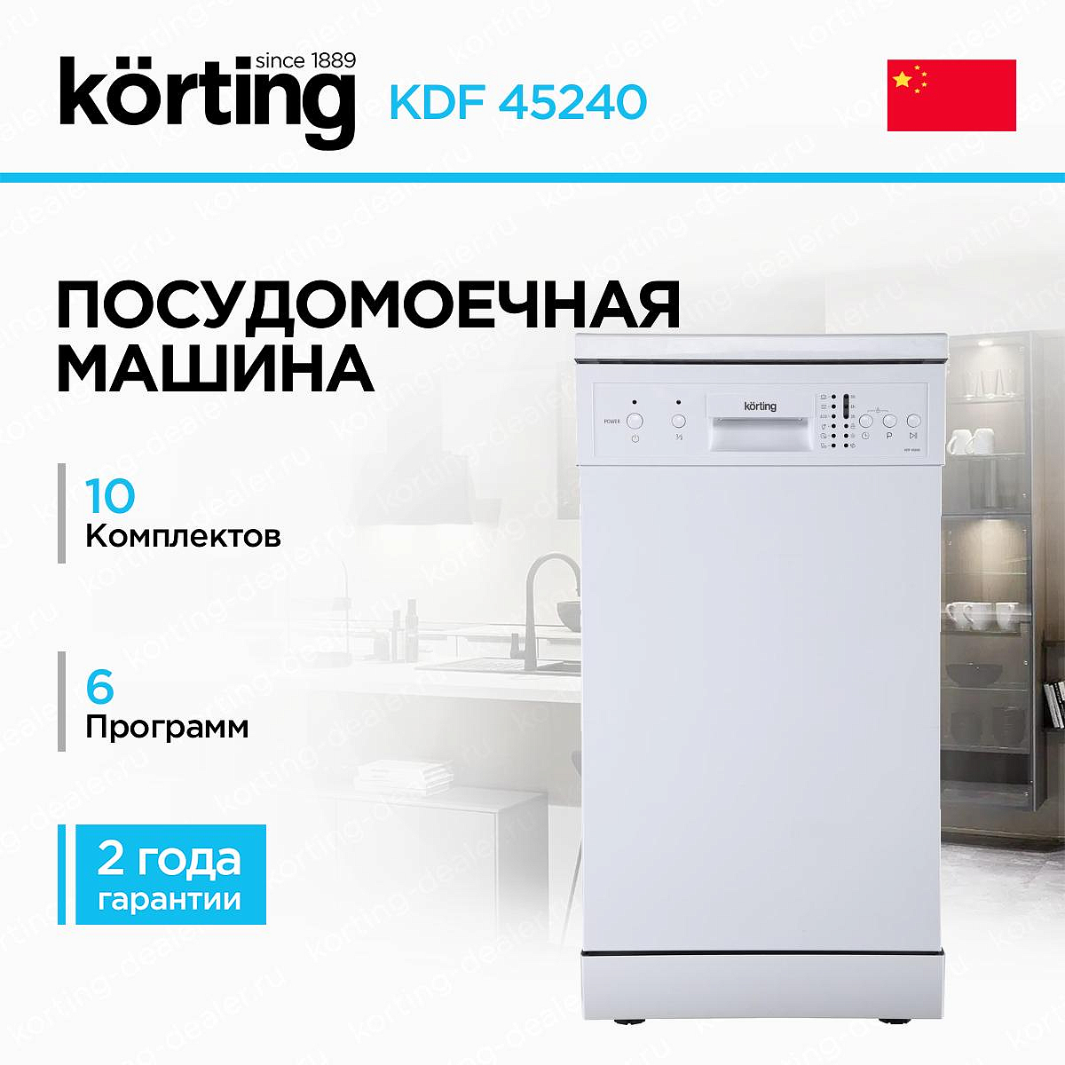 Внешний вид Korting KDF 45240 выполнен в классическом стиле, характерном для отдельностоящей техники. Корпус цвета белый придает прибору аккуратный, светлый вид, который органично вписывается в большинство кухонных интерьеров — от скандинавского минимализма до современной классики. Белый цвет визуально расширяет пространство, что особенно ценно для небольших кухонь.