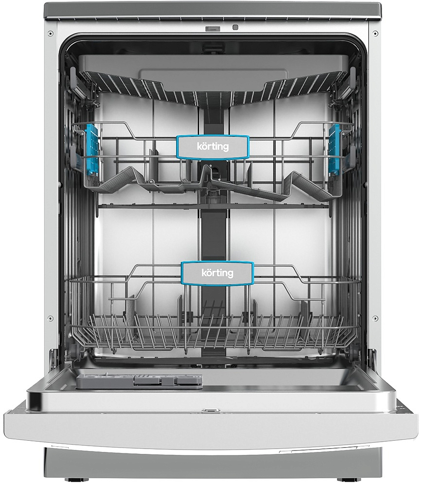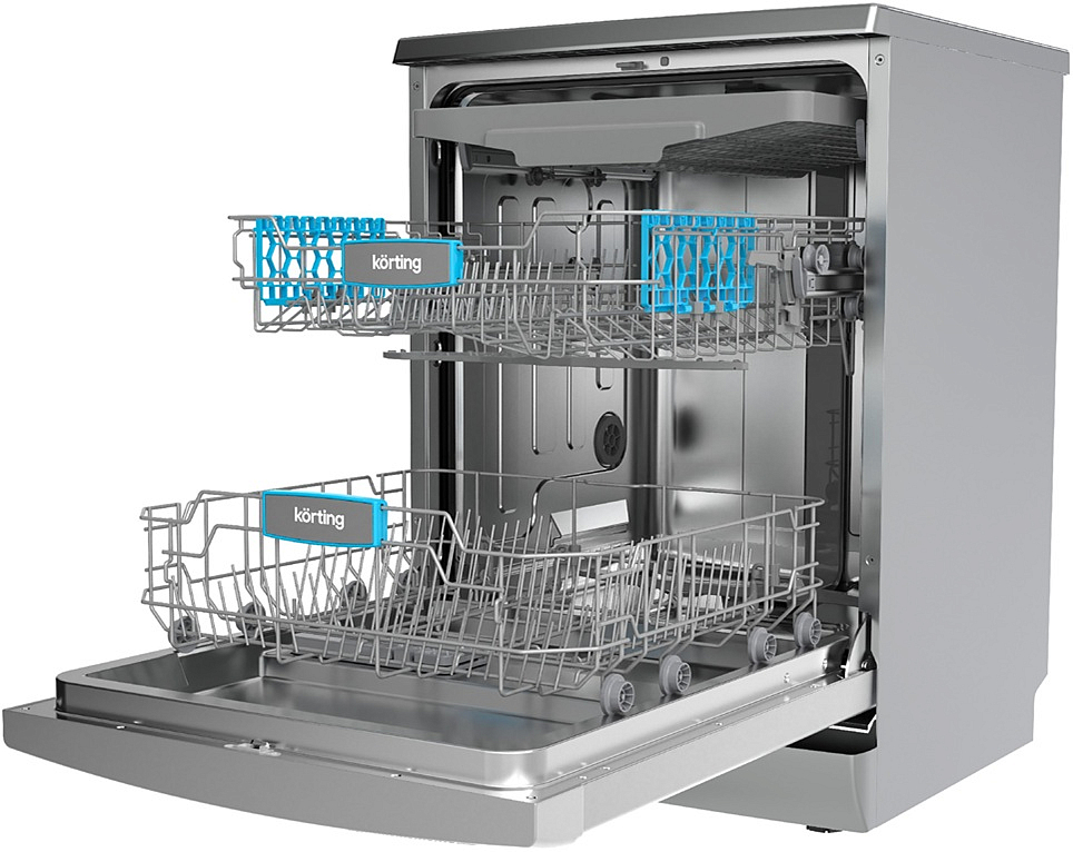 Внутреннее пространство продумано до мелочей: камера из нержавеющей стали устойчива к коррозии и легко очищается. Три уровня загрузки включают верхнюю корзину с системой Easy Lift (её можно поднять, освободив место для высоких бокалов), средний отсек для хрупкой посуды и нижнюю корзину под кастрюли и сковороды. Отдельная C-Shelf для столовых приборов предотвращает их перемешивание и ускоряет расстановку. Проточный ТЭН обеспечивает быстрый и равномерный нагрев, а два S-образных разбрызгивателя охватывают всю посуду мощными, но экономичными струями. Встроенная система фильтрации, тестер жёсткости воды и слайдерный диспенсер для моющих средств упрощают подготовку. Благодаря активной сушке и качественной мойке прибор получил класс A по обоим параметрам — посуда выходит чистой и без разводов.