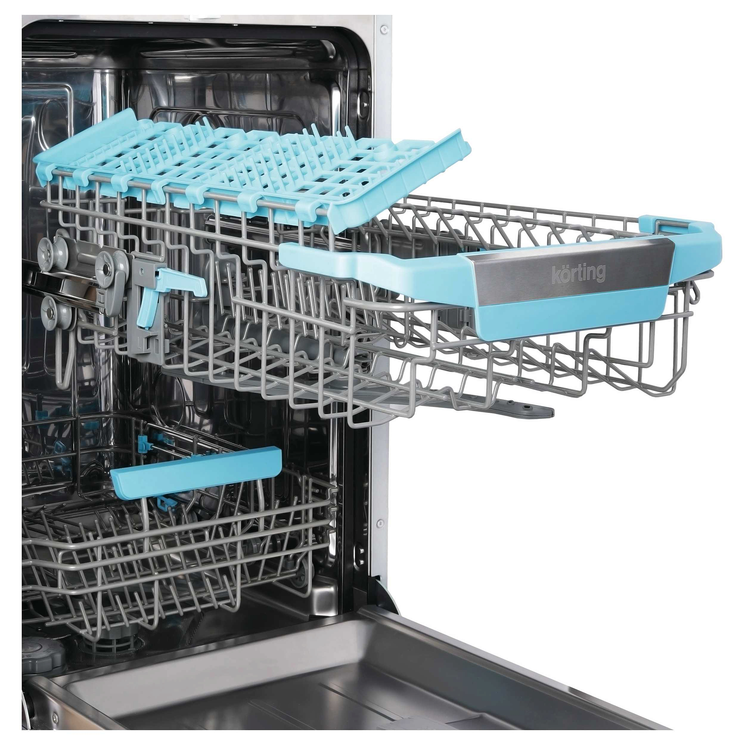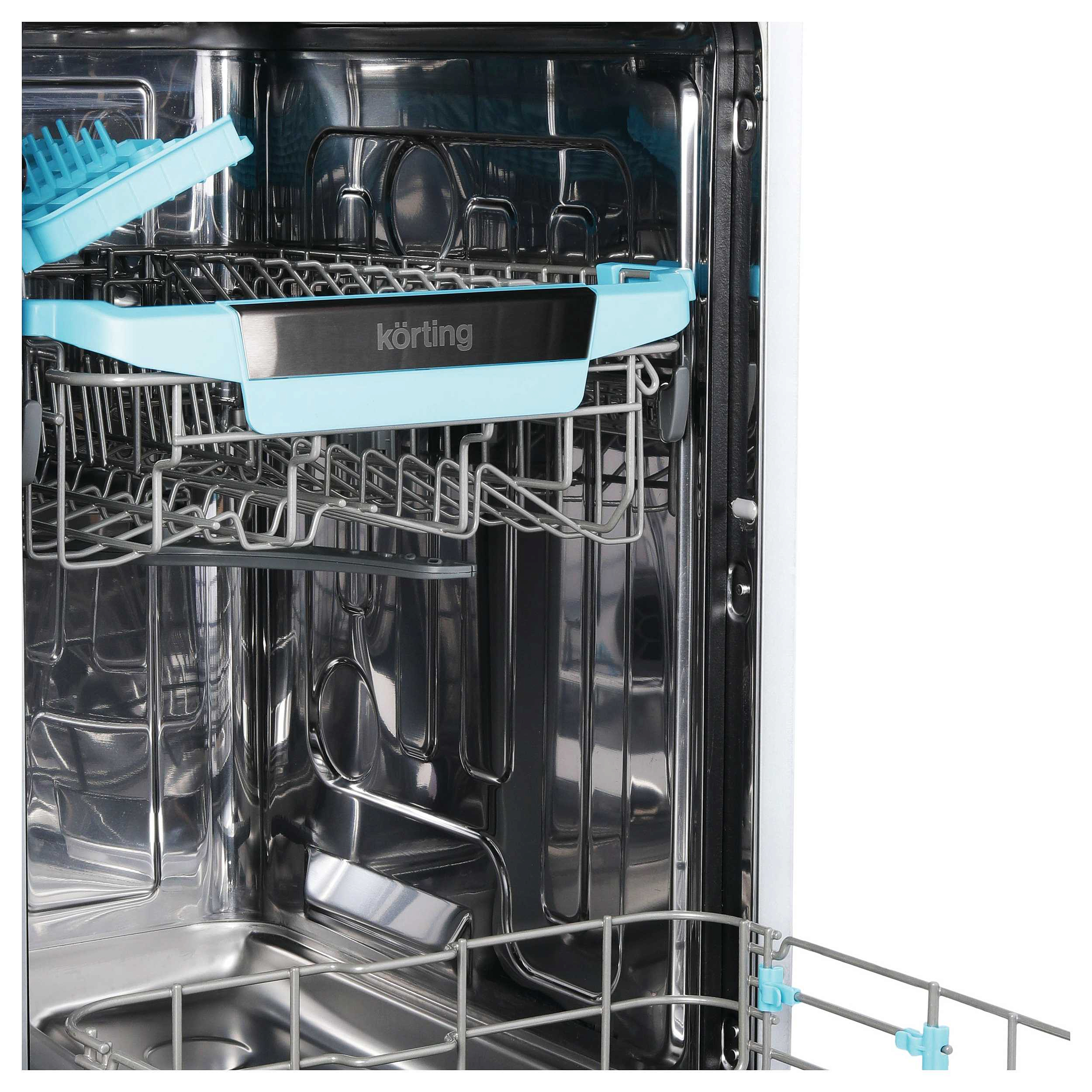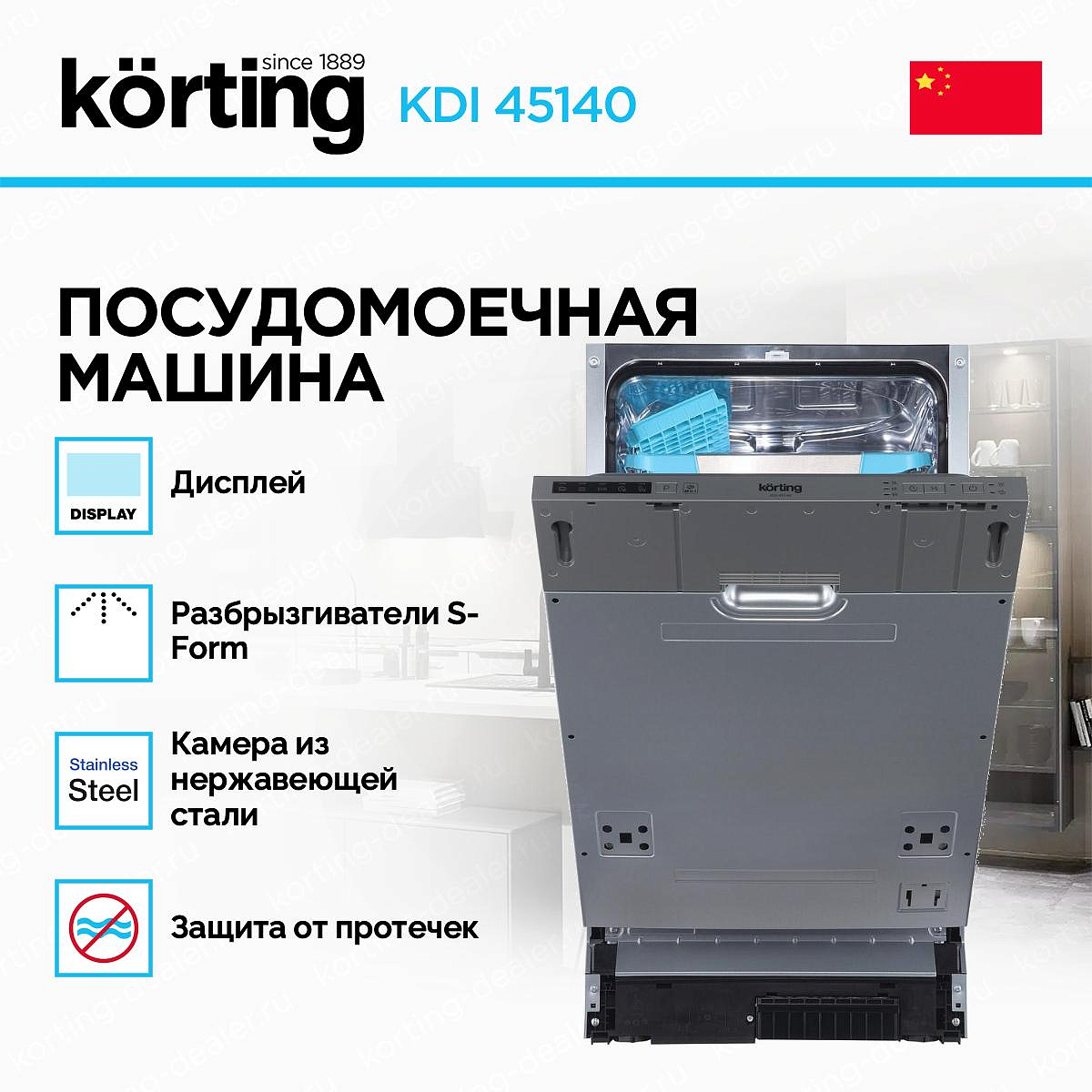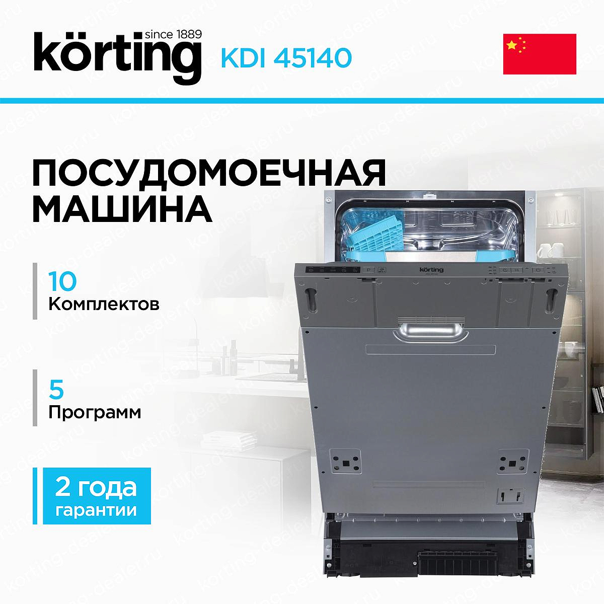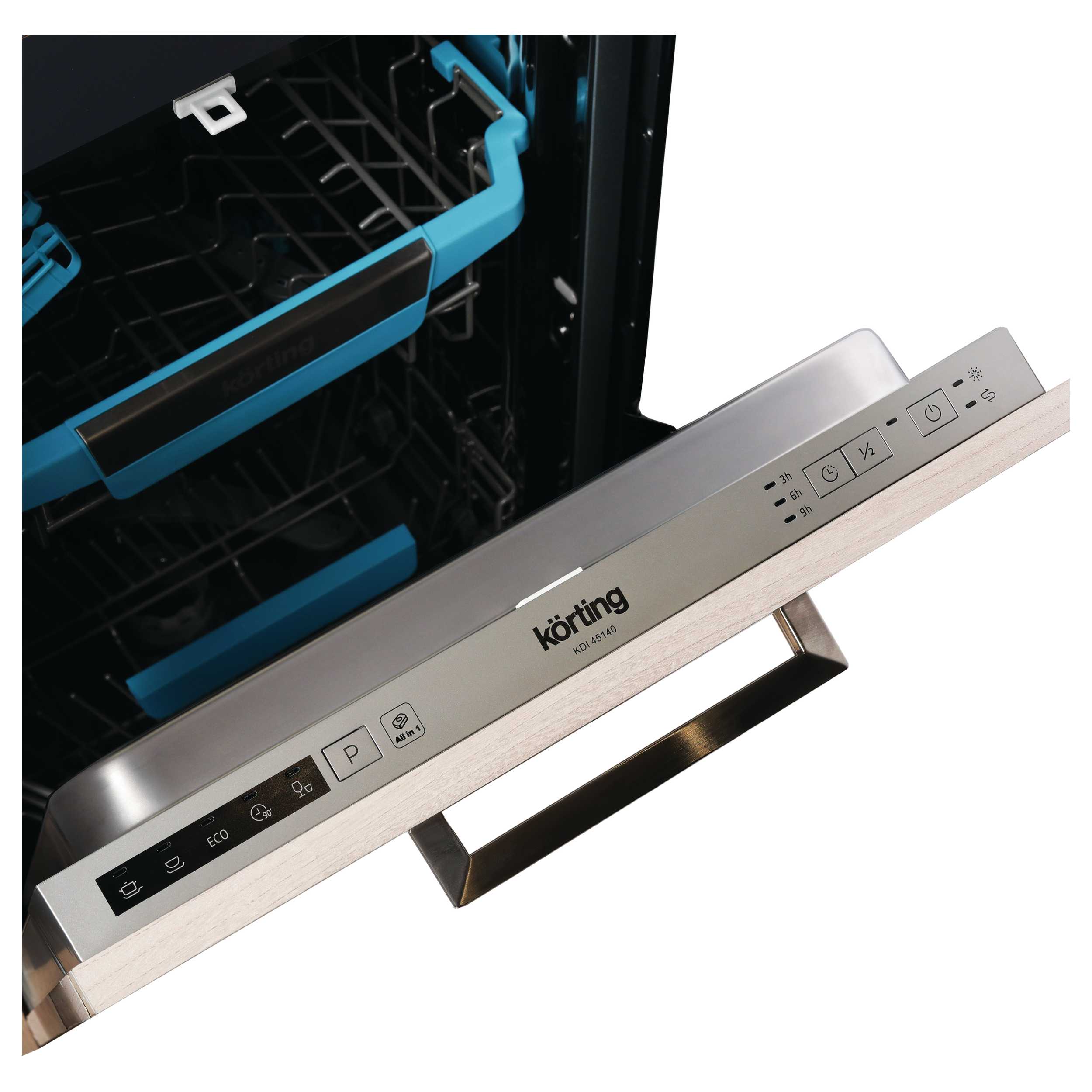 Использование посудомоечной машины каждый день в быту позволяет значительно экономить время на мытье тарелок, чашек, бокалов, столовых приборов и даже кастрюль и сковородок. А для дома, где вечерами за столом часто собираются большие семьи или компания друзей, посудомоечная машина — просто необходимость. Korting KDI 45140 — это полностью встраиваемая узкая посудомойка. Она вмещает в себя до 10 комплектов посуды, т.е. это достаточно вместительный, большой экземпляр.