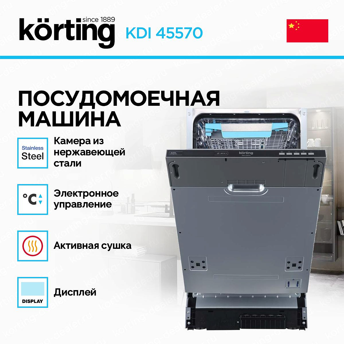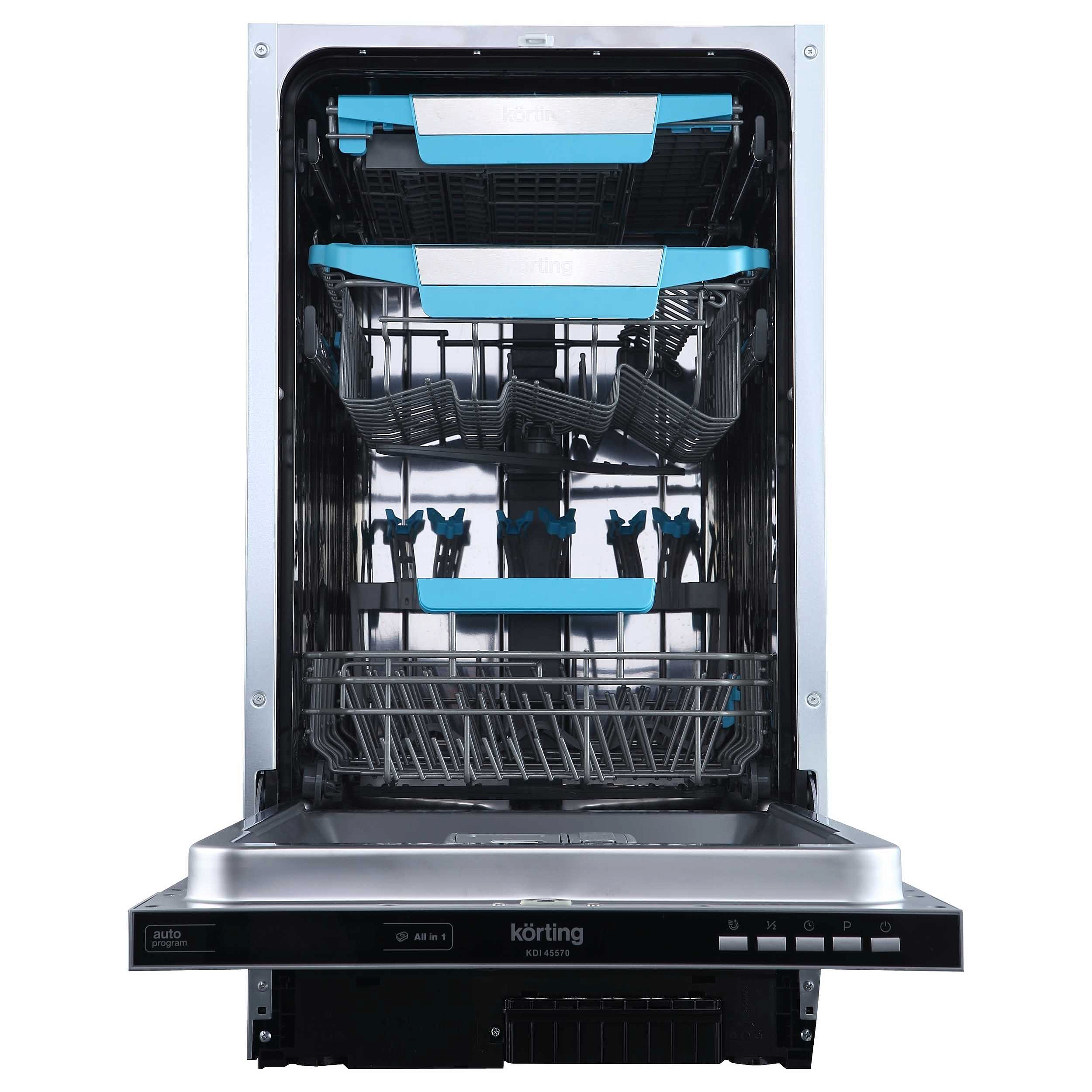 Встраиваемая посудомоечная машина Korting KDI 45570 представлена в цвете «Нержавеющая сталь», а ее панель управления — в черном. Она поддерживает 8 режимов и автоматическую программу, которая предусматривает адаптацию под различные условия.