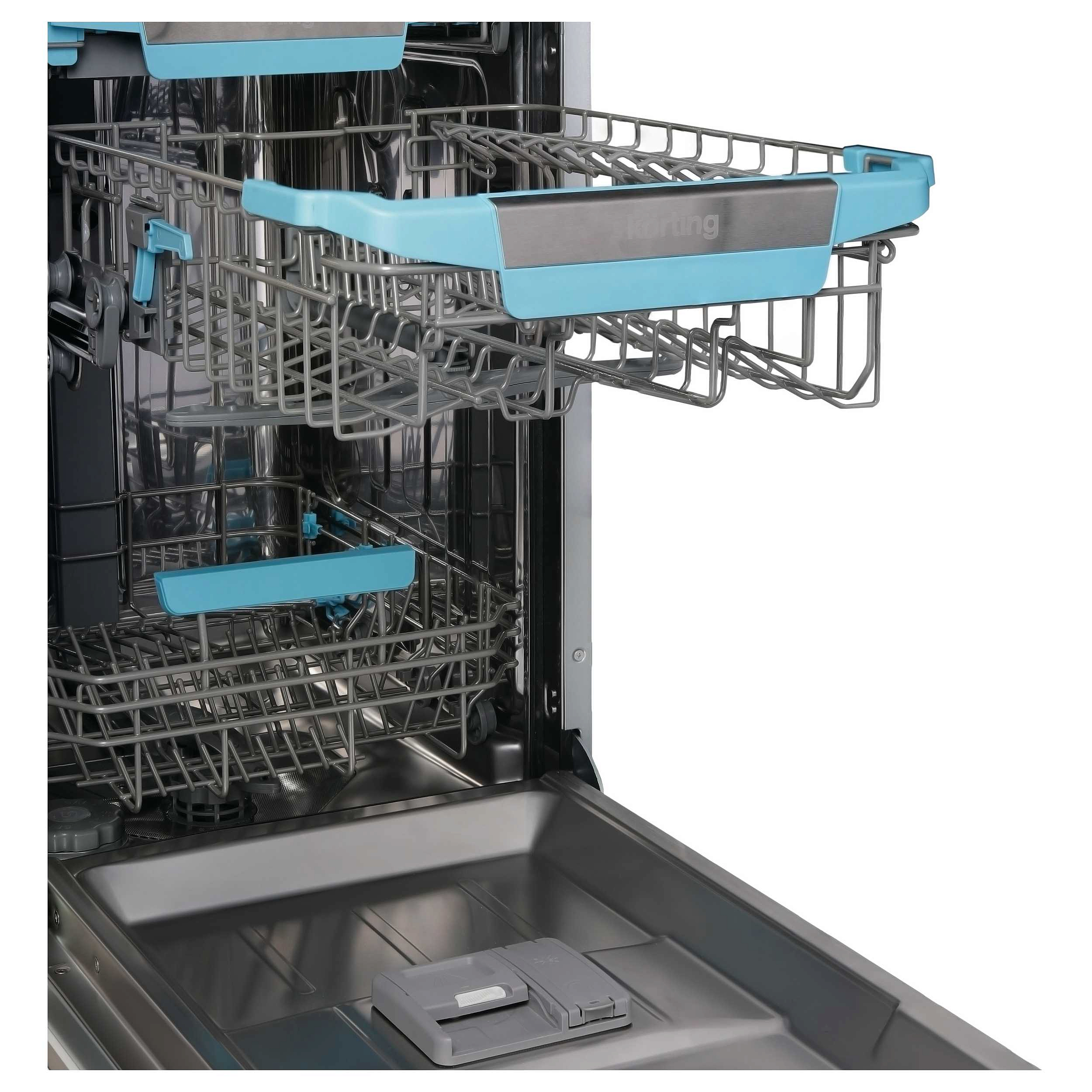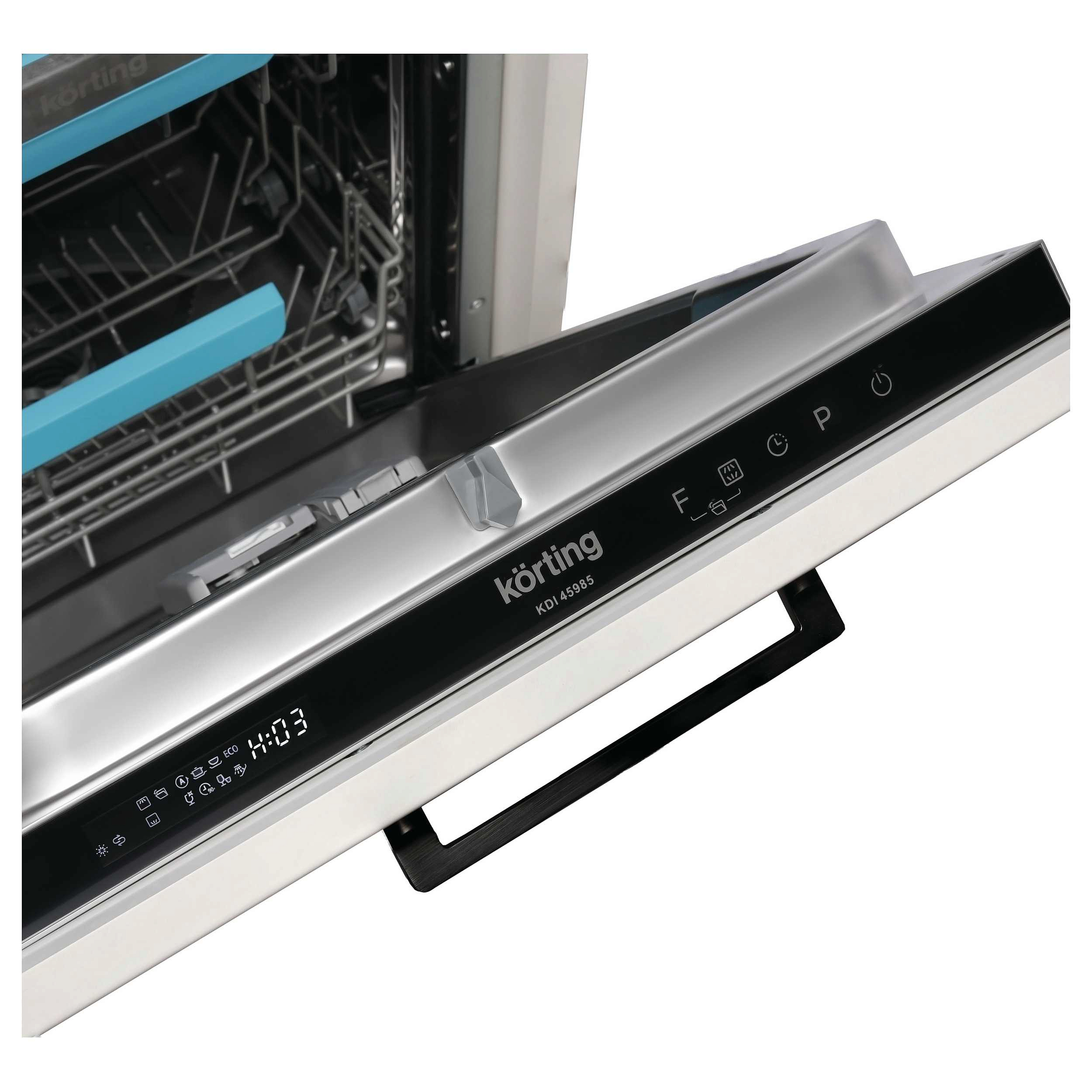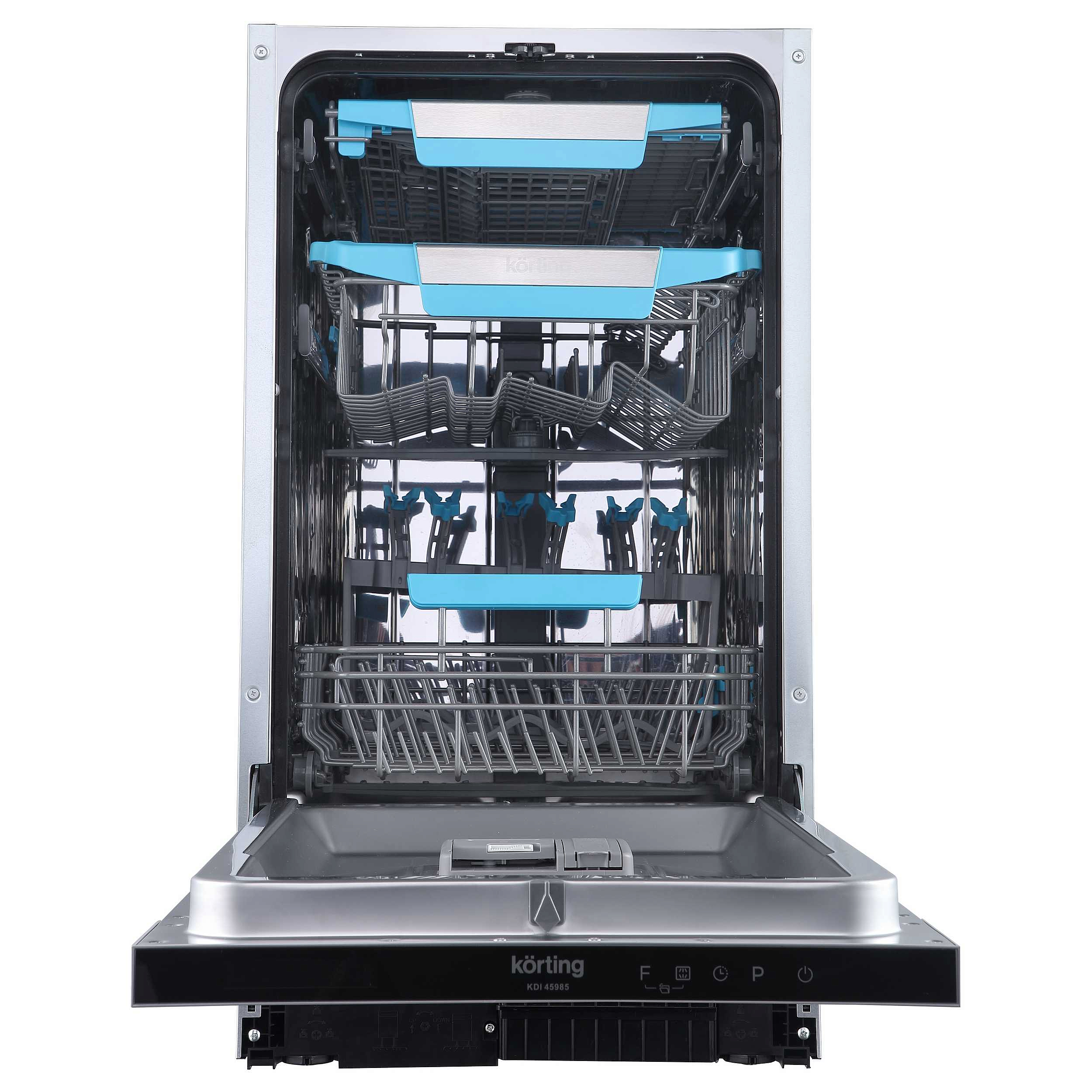 Встраиваемая посудомоечная машина Korting KDI 45985 подойдёт для семьи из четырёх человек, а также отлично впишется небольшую кухню или студию за счёт своих габаритов: ширина — 44,8 см, высота — 81,5-87,5 см, глубина — 55 см.