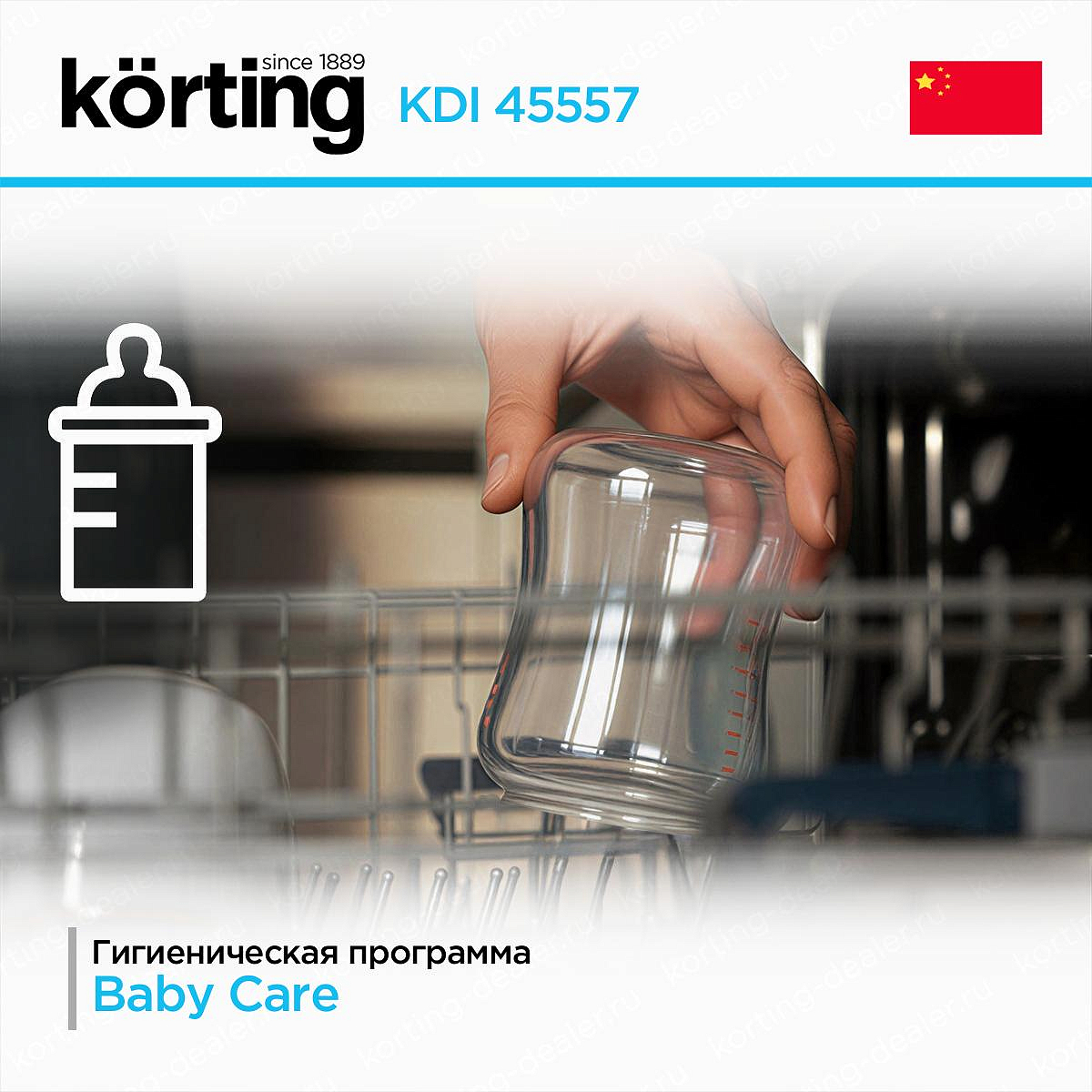 Korting KDI 45557 оснащена набором передовых функций, которые обеспечивают эффективное, бережное и гигиеничное мытье посуды. Центральное место занимает программа Baby Care — специальный режим, созданный для семей с маленькими детьми и людей, страдающих аллергией. Цикл отличается повышенной температурой ополаскивания и увеличенной продолжительностью, что обеспечивает качественную дезинфекцию посуды, удаление остатков моющих средств и уничтожение микроорганизмов.