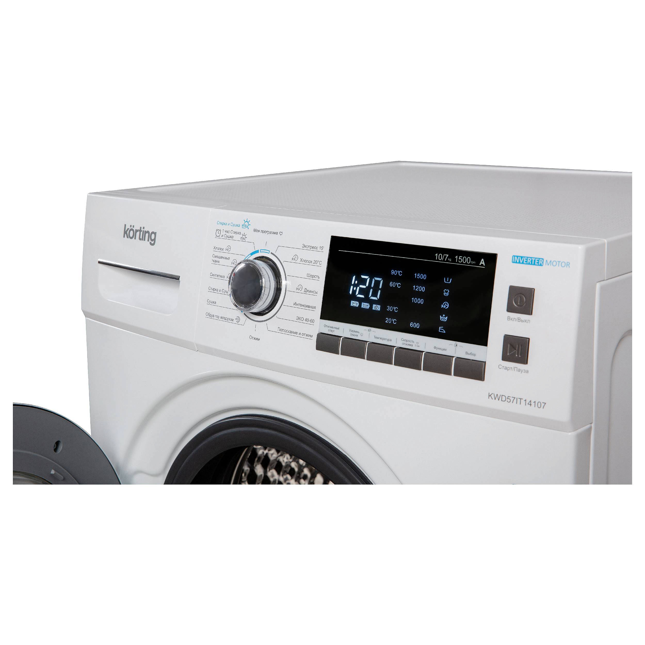 Электронная панель управления оснащена информативным дисплеем с LED-подсветкой, отображающим текущий этап цикла, выбранные опции и оставшееся время. Пользователю доступны отложенный запуск до 24 часов и регулировка скорости отжима. В основе работы — инверторный двигатель, обеспечивающий плавный старт, сниженный уровень шума и экономию электроэнергии. Также предусмотрены диспенсер для жидких моющих средств, автоматическая блокировка двери, защита от избытка пены и дисбаланса, частичная система защиты от протечек и детский замок.