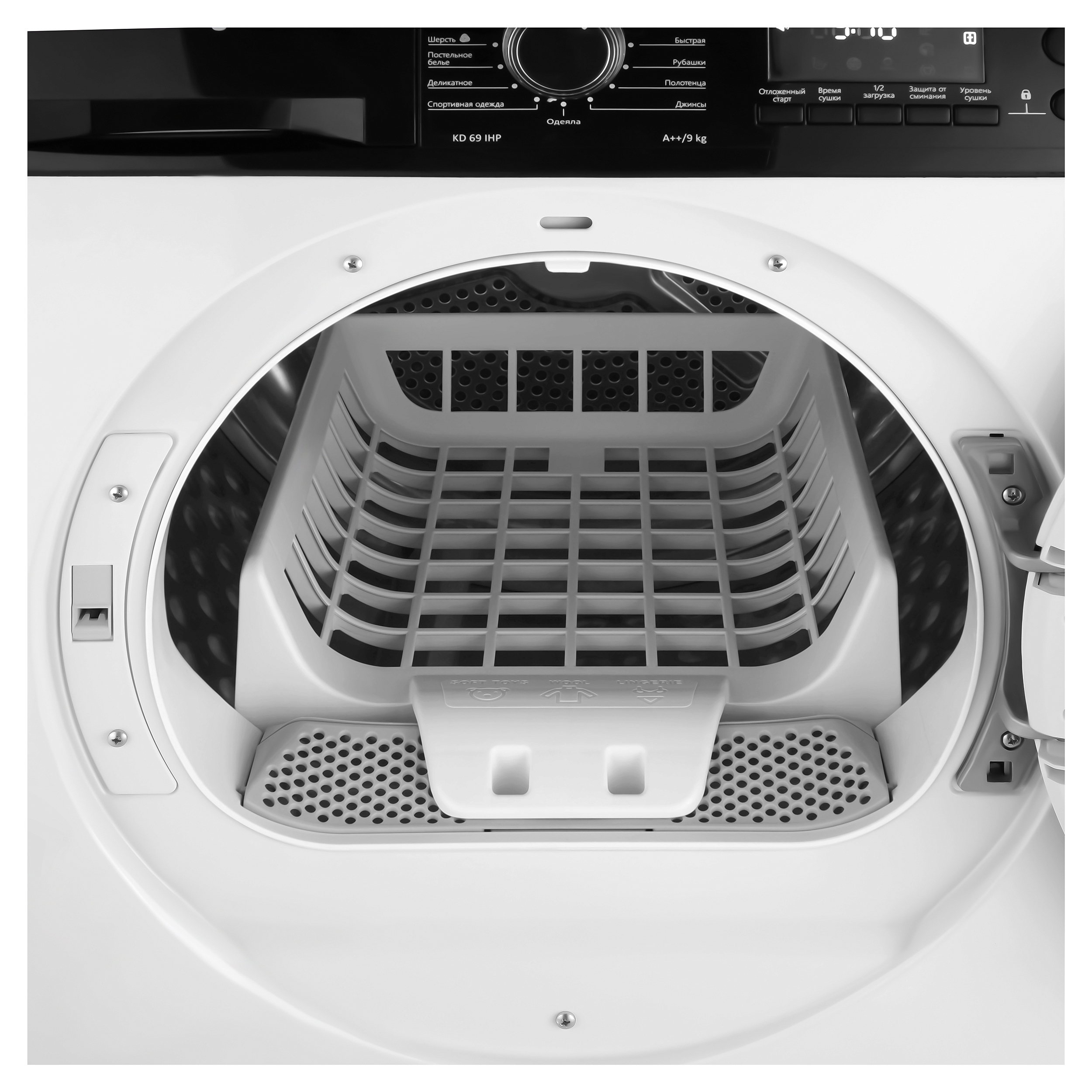 Обслуживание продумано до мелочей: контейнер для конденсата оснащён индикатором заполнения, а при желании можно подключить прямой слив в канализацию. Для бережной сушки мелких или чувствительных вещей предусмотрена встроенная сетчатая корзина. Безопасность обеспечена блокировкой дверцы во время работы, защитой от вмешательства детей и возможностью отключения звукового сигнала. Габариты — 85×59,6×63,6 см — позволяют устанавливать машину как отдельно, так и в колонну над стиральной машиной. Вес 57 кг и кабель длиной 1,5 м упрощают транспортировку и подключение к стандартной розетке.