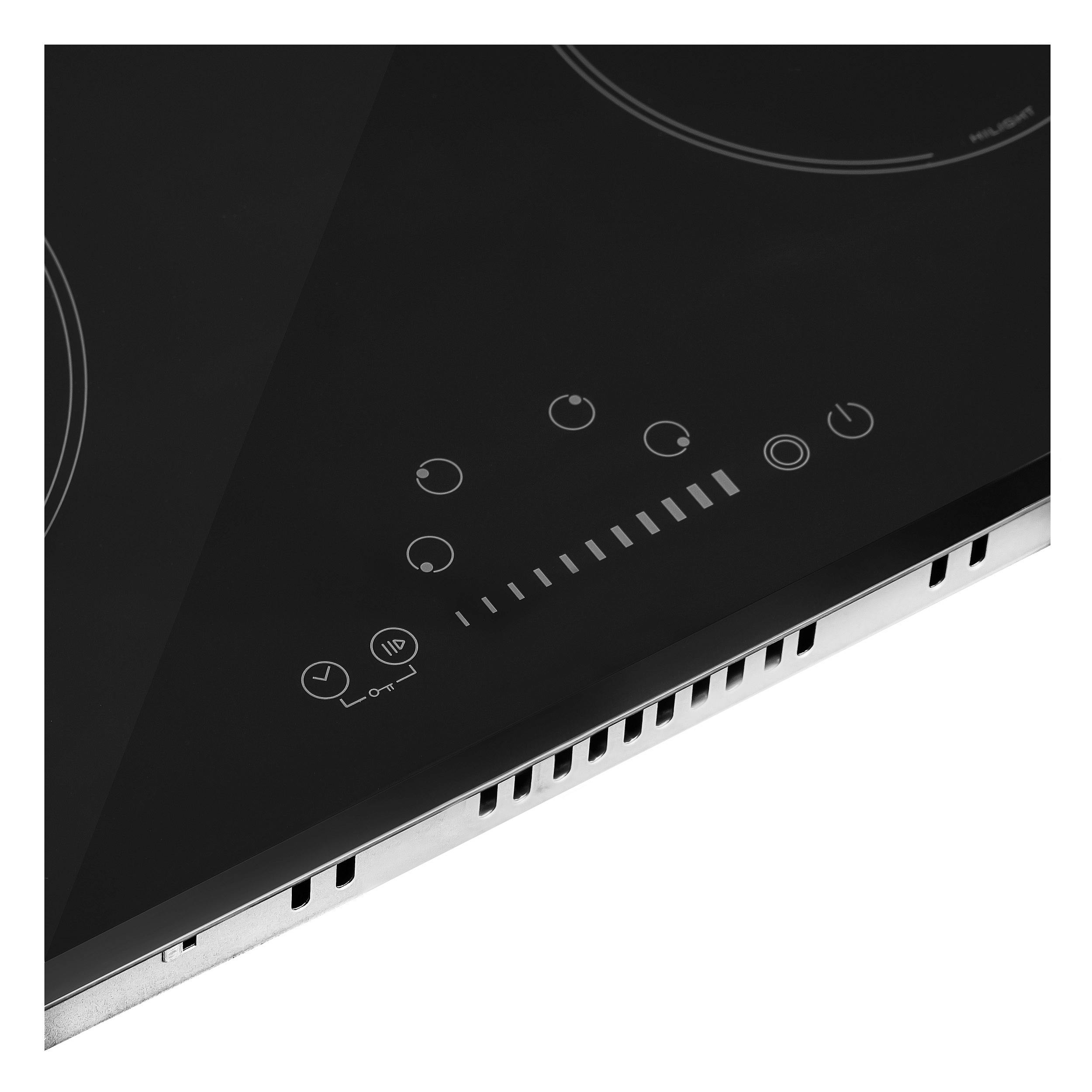 Поверхность панели выполнена из стеклокерамики черного цвета, что придает ей строгий и современный вид. Скошенные края рамки подчеркивают минималистичный дизайн и делают эту модель идеальной для любой кухни. Материал поверхности обеспечивает легкую очистку и устойчивость к высоким температурам.