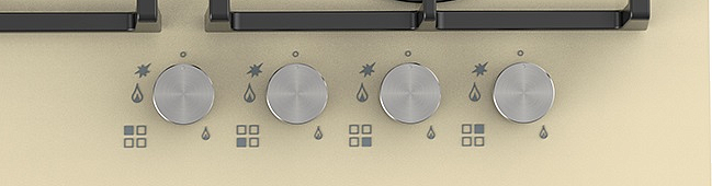 Панель управления является механической. Она оснащена четырьмя металлическими поворотными переключателями в цвете нержавеющей стали. Этот контраст бежевого стекла и стальных элементов подчеркивает качество сборки и надежность. Металлические рукоятки гарантируют точное, плавное управление пламенем, а их эргономичное расположение не мешает использованию крупной посуды. Дизайн в целом остается сдержанным и максимально функциональным.