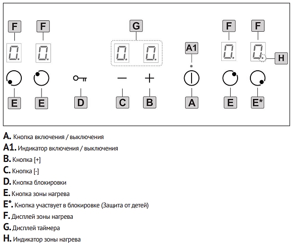Индикация остаточного тепла может быть одноступенчатой и двухступенчатой (зависит от конкретной модели). Эта система безопасности выводит на дисплей варочной панели информацию о том, насколько поверхность конфорки горячая. Обычно литера «H» означает очень высокую температуру, а «h» — чуть ниже. Но, тем не менее, риск получить ожог остаётся.