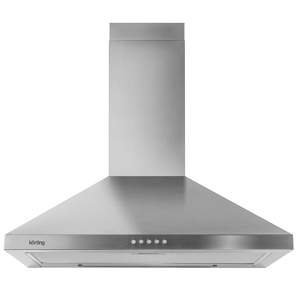 Дизайнерская вытяжка Korting KHC 6431 X шириной 60 см монтируется к стене, из-за сходства с каминными дымоходами подобные модели называют приборами «каминного типа». Управление осуществляется при помощи кнопок, расположенных на передней панели.