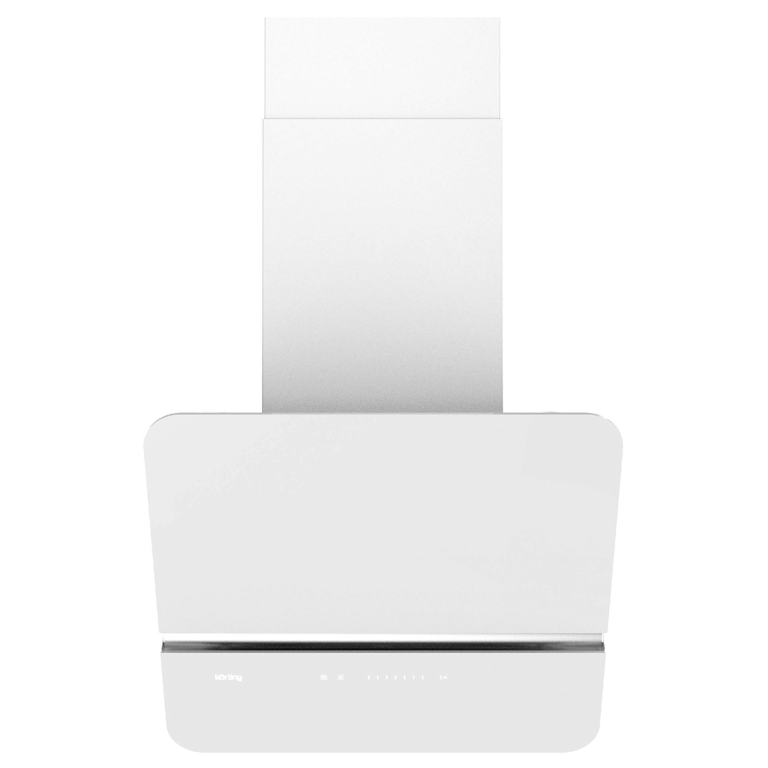 Вытяжка в белом исполнении, сочетающая нержавеющую сталь и закалённое стекло. Её лаконичный дизайн и компактные пропорции (ширина 60 см, глубина 35 см) позволяют органично вписаться в любую кухню, не перегружая пространство. Наклонная форма не только экономит место, но и улучшает захват пара и запахов прямо у источника. Высота регулируется в диапазоне 86,7-125,2 см, что даёт гибкость при монтаже над разными типами варочных поверхностей. Устройство крепится к стене, а воздуховод (150/120 мм) можно скрыть внутри шкафов или вдоль стены для аккуратного вида.