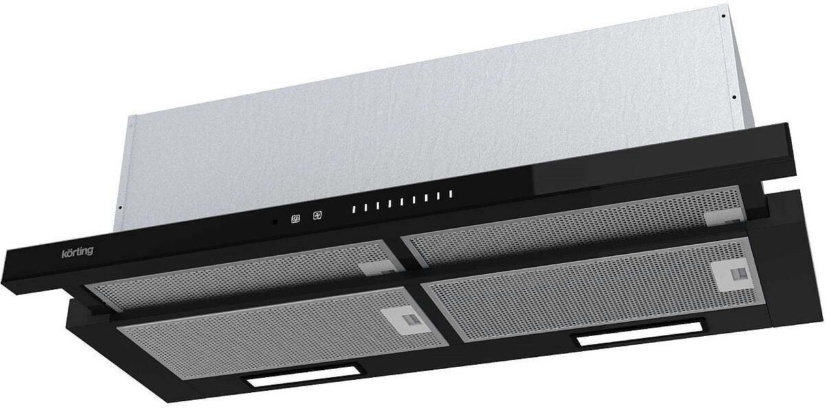 Вытяжка — это стильное и функциональное решение для современной кухни. Её корпус шириной 89,8 см выполнен из комбинации чёрной окрашенной стали и глянцевого стекла, что придаёт устройству лаконичный, но выразительный вид. Благодаря выдвижной передней панели техника визуально «растворяется» в подвесном шкафу, открывая доступ к сенсорному управлению только при необходимости. Тонкий профиль (высота 26,5 см) и регулируемая глубина (от 30,9 до 49,6 см) позволяют легко встроить модель даже в компактные кухонные модули, не нарушая целостности интерьера.